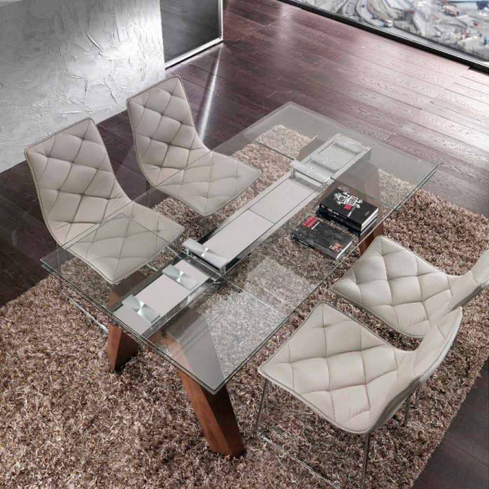 Caractéristiques Table extensible Caronte avec plateau en verre trempé transparent, structure en acier inox poli et pieds en bois massif.
