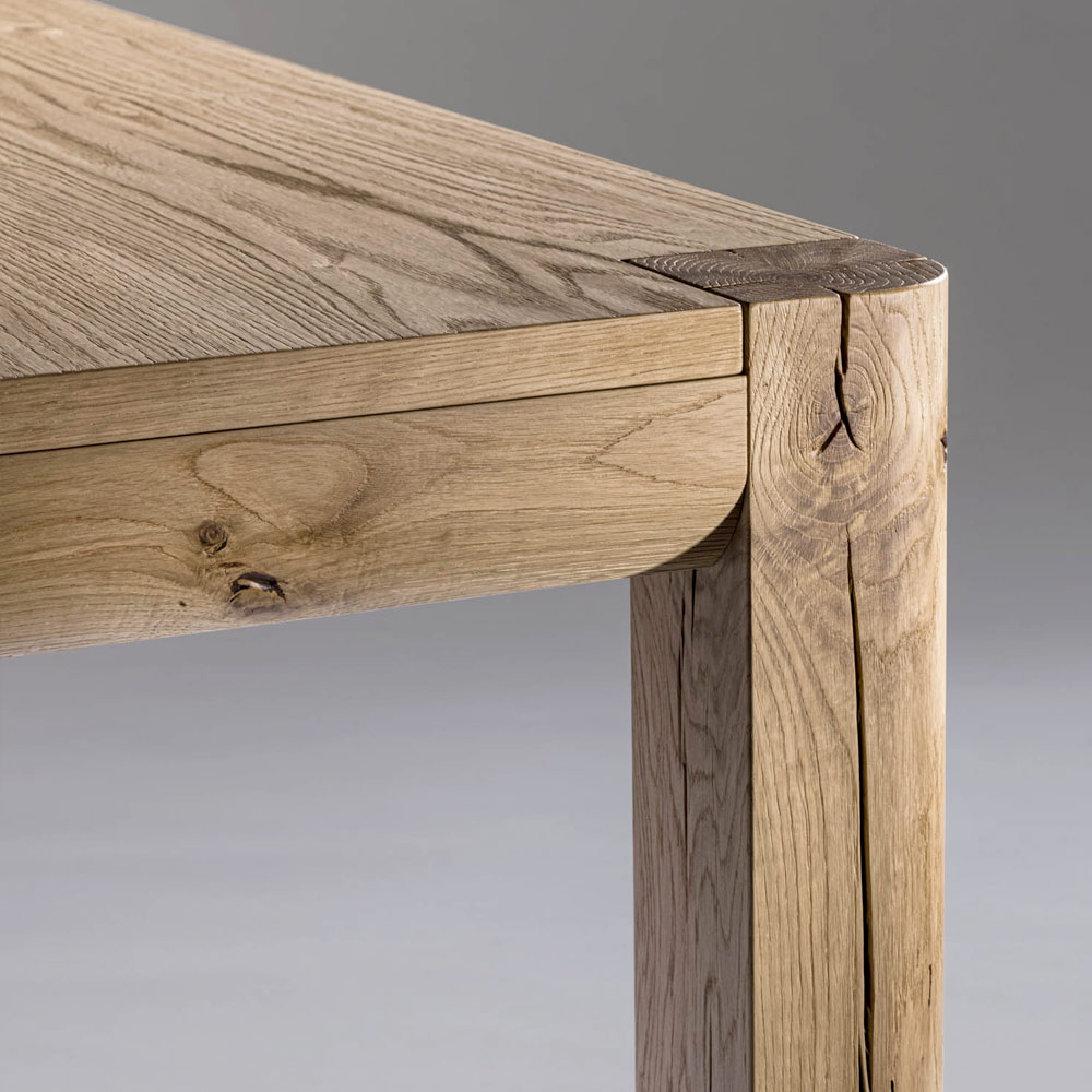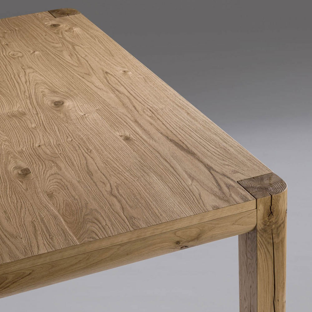 Table extensible avec plateau en latté plaqué chêne naturel et pieds carrés solides avec fissures et nœuds12x12cm. Dimensions H 77 cm, épaisseur 3 cm. Les extensions sont incluses .