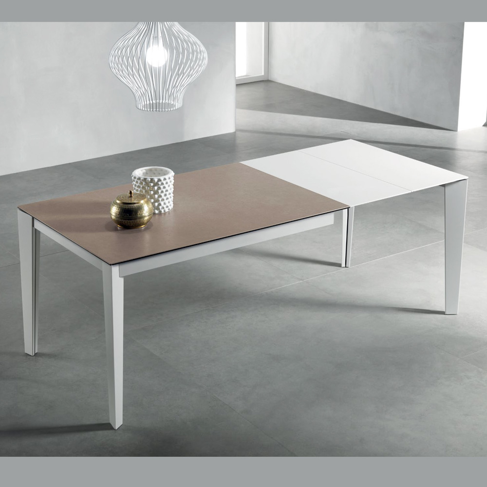 Élégante et fonctionnelle, cette table rectangulaire extensible allie design moderne et praticité. Son plateau en vitrocéramique de 10/11 mm d'épaisseur, finition Fokos Terra , et ses pieds en métal laqué blanc mat lui confèrent stabilité et une touche contemporaine.