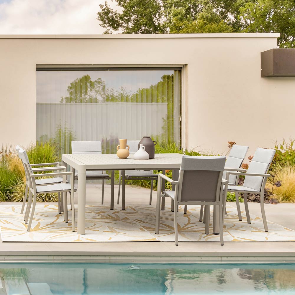 Cette table de jardin est un véritable bijou de design minimaliste et fonctionnel . Sa surface en aluminium de haute qualité, caractérisée par des lignes épurées, évoque un style moderne et sophistiqué qui ne passe pas inaperçu. Les couleurs neutres le rendent extrêmement polyvalent et adapté à tout environnement extérieur, du balcon urbain au patio d'une villa de campagne. Non seulement esthétique, mais aussi extrêmement pratique et durable ; Cette table est construite pour résister aux éléments, assurant durabilité et stabilité dans le temps. Avec ses lignes simples et sa silhouette élégante, cette table devient le protagoniste de chaque moment convivial en plein air, offrant un maximum de confort et d'hospitalité . Expression d'un pur style contemporain , cette table de jardin est le choix idéal pour ceux qui aiment accueillir, vivre et partager leur vie en plein air avec classe et simplicité .