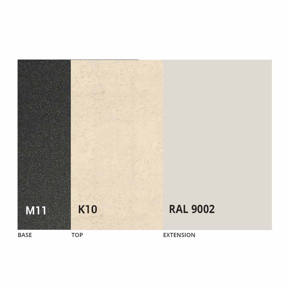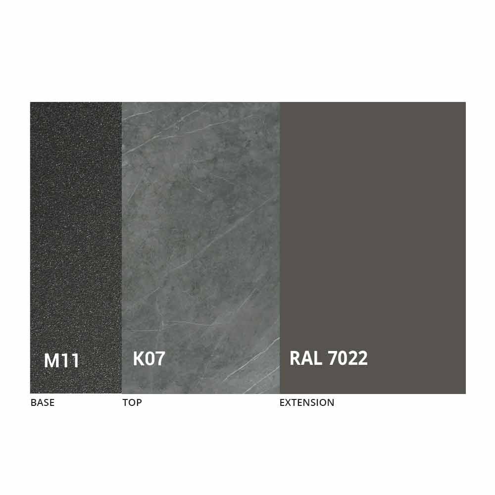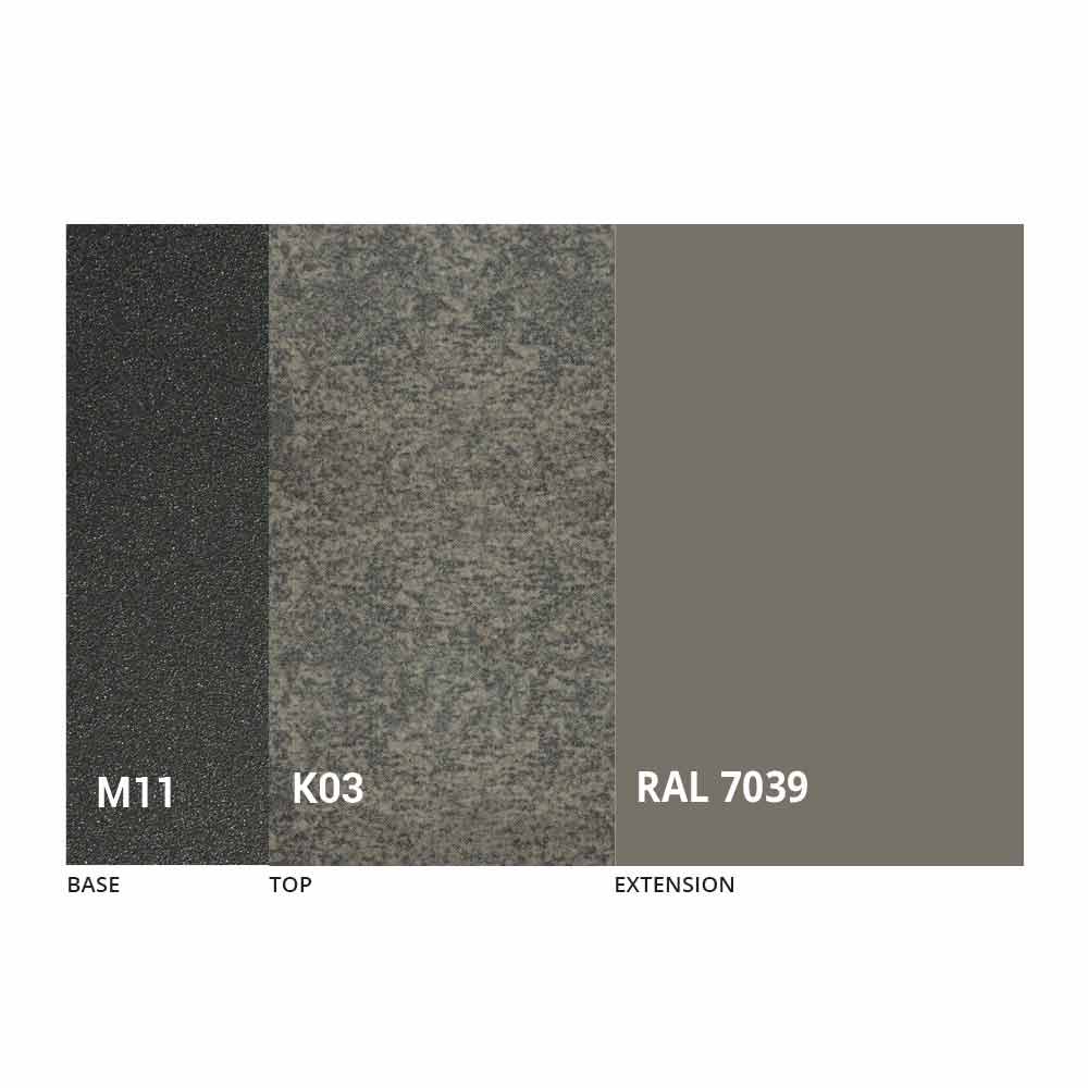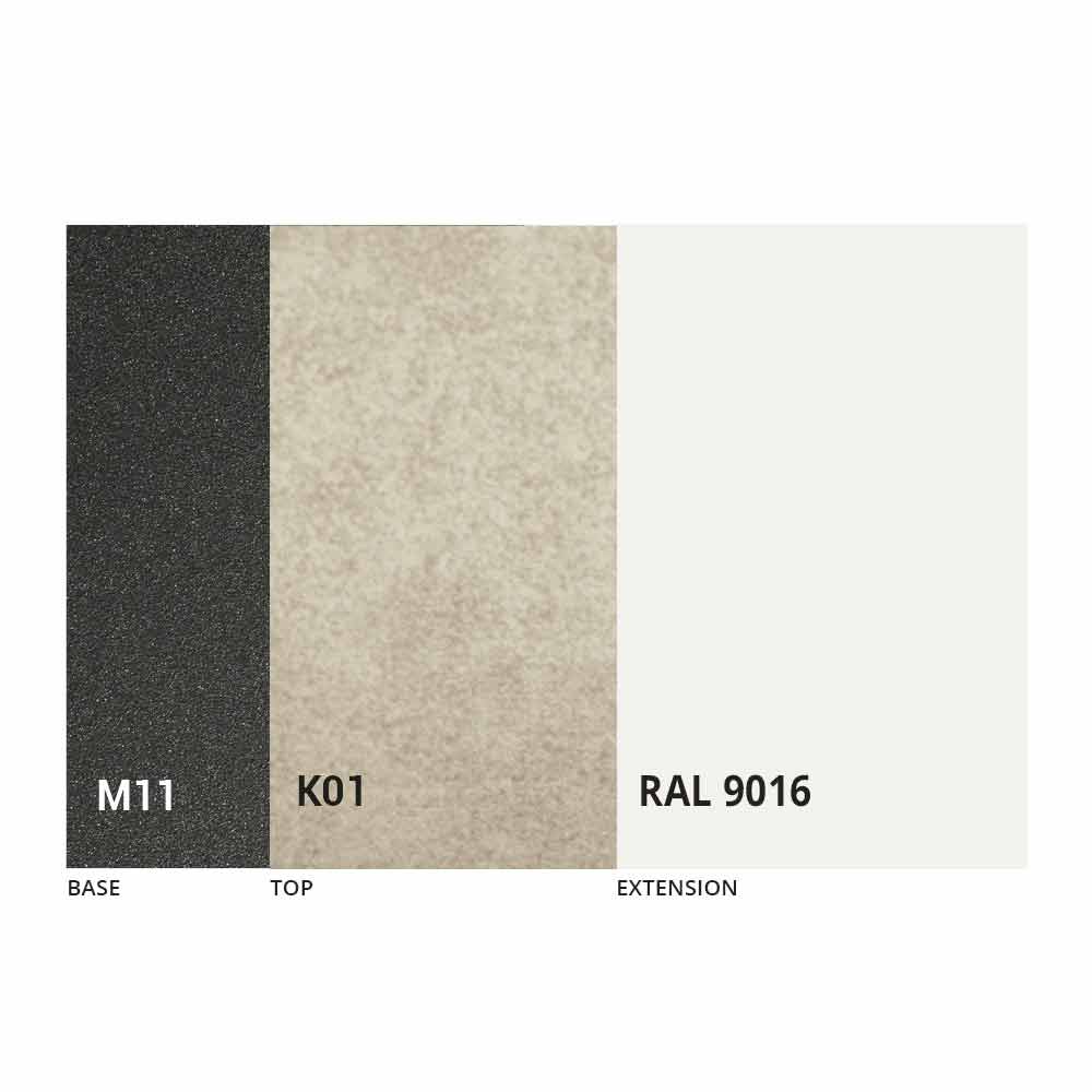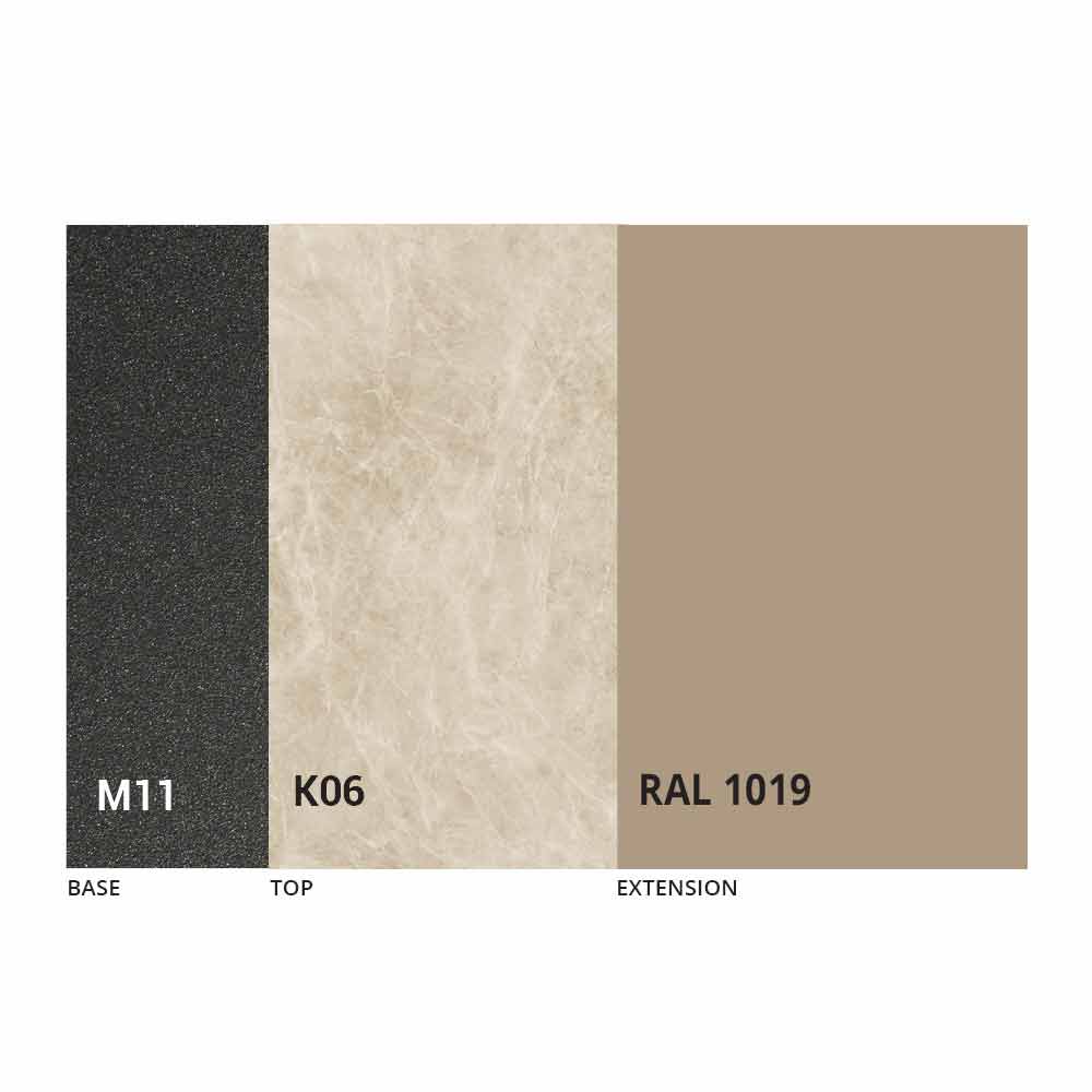 Le plateau et la base de la table peuvent être personnalisés avec différents matériaux et finitions d'échantillons ou laquage RAL. Pour plus d'informations, contactez-nous en utilisant le formulaire "
