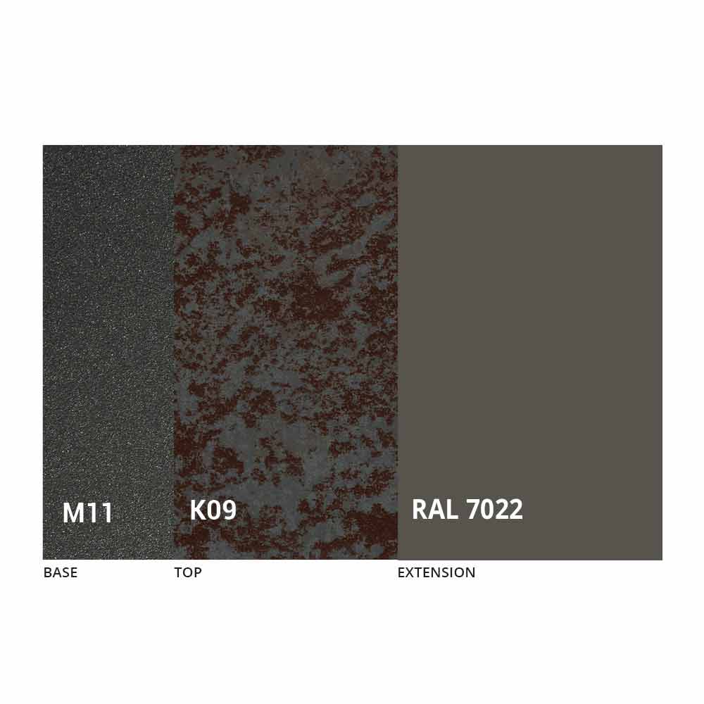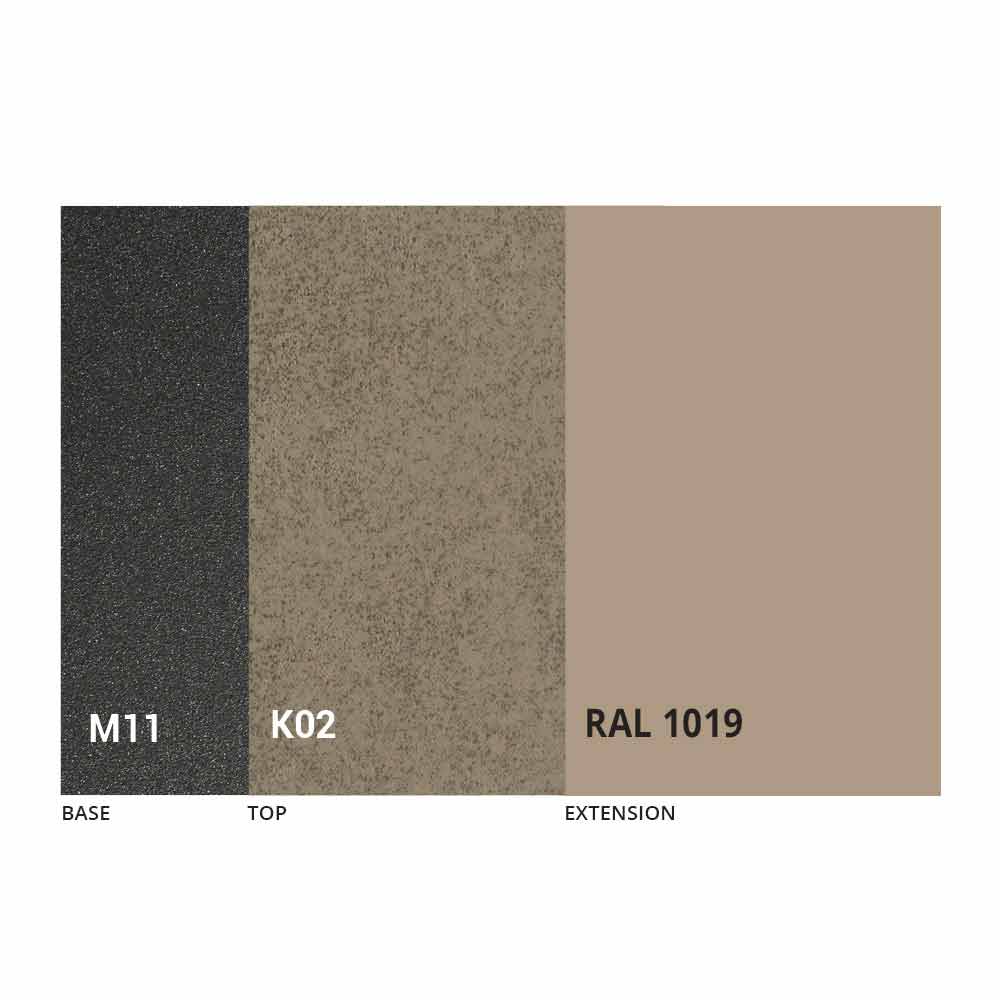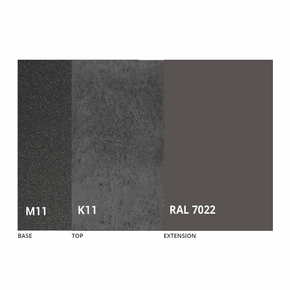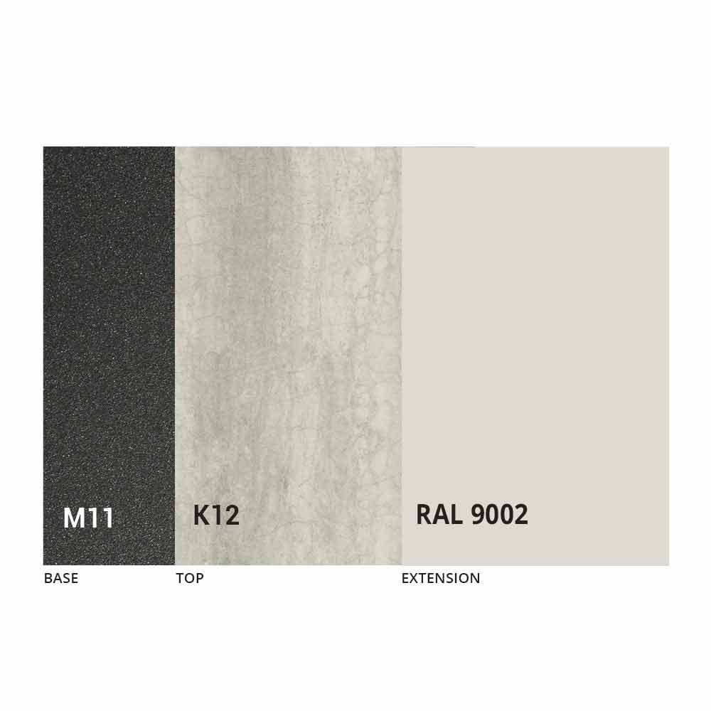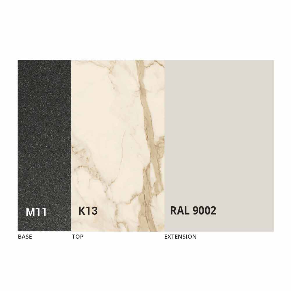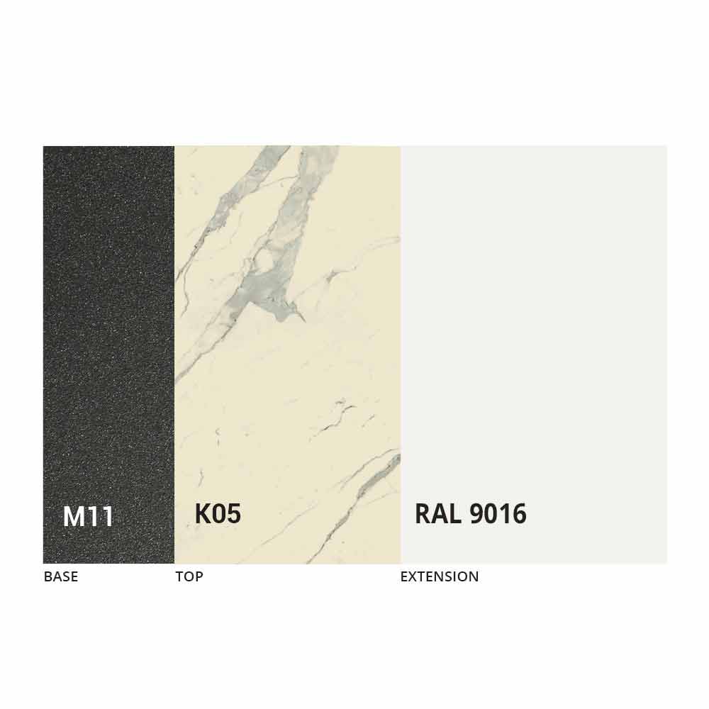 Le plateau et la base de la table peuvent être personnalisés avec différents matériaux et finitions d'échantillons ou laquage RAL. Pour plus d'informations, contactez-nous en utilisant le formulaire "