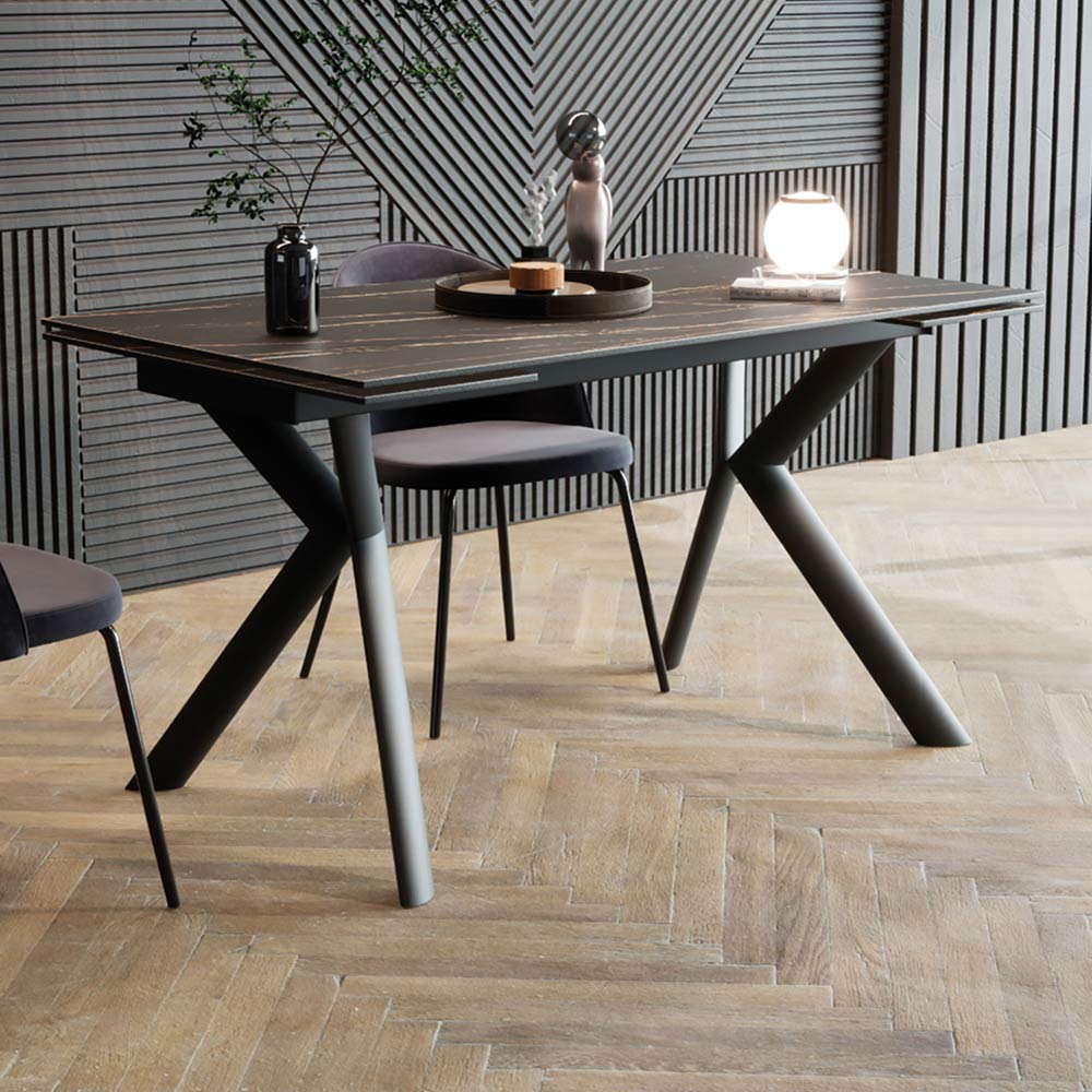 Table à manger extensible avecstructure en métal peint anthracite et plateau en grès cérame finition sahara noir .Un produit solide et résistant caractérisé par un design exclusif et moderne, idéal pour ceux qui aiment un style essentiel et polyvalent, capable de compléter l'ameublement de leur salle à manger ou cuisine avec élégance et personnalité. Grâce à la merveilleuse combinaison de matériaux et de finitions, il représente la solution idéale pour ceux qui ont besoin d'un produit fonctionnel mais en même temps d' un grand impact visuel .