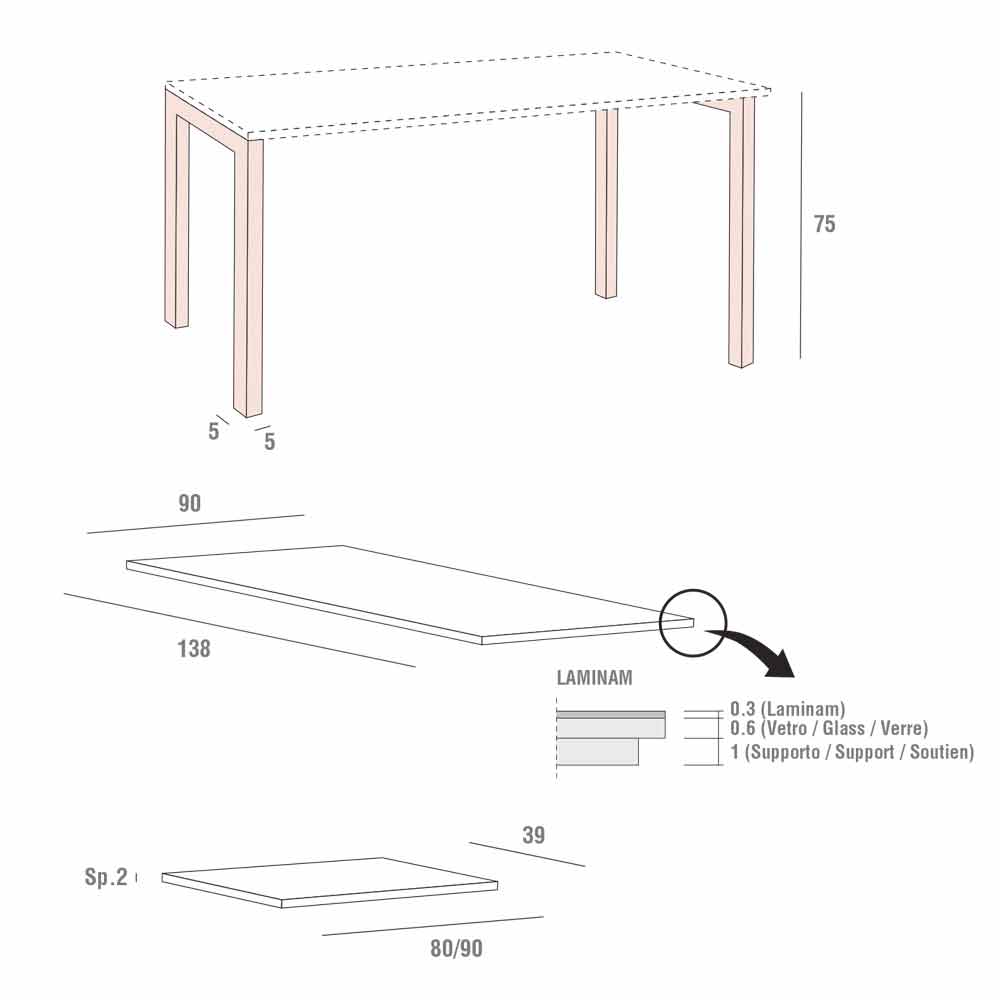 - L 160/199/238 x P 90 x H 75,5 cm.