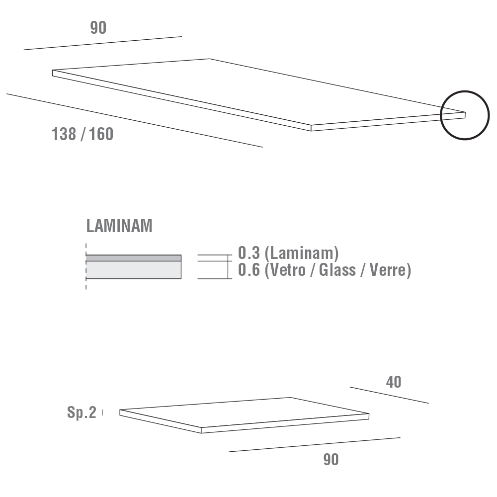- L 160/200/240 x P 90 x H 76,5 cm.