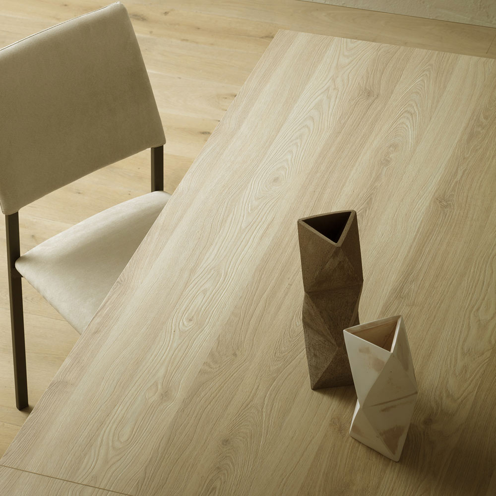 NB : le piètement et le plateau sont disponibles dans une large gamme de finitions différentes. La continuité du grain entre le plateau et la rallonge n'est pas garantie