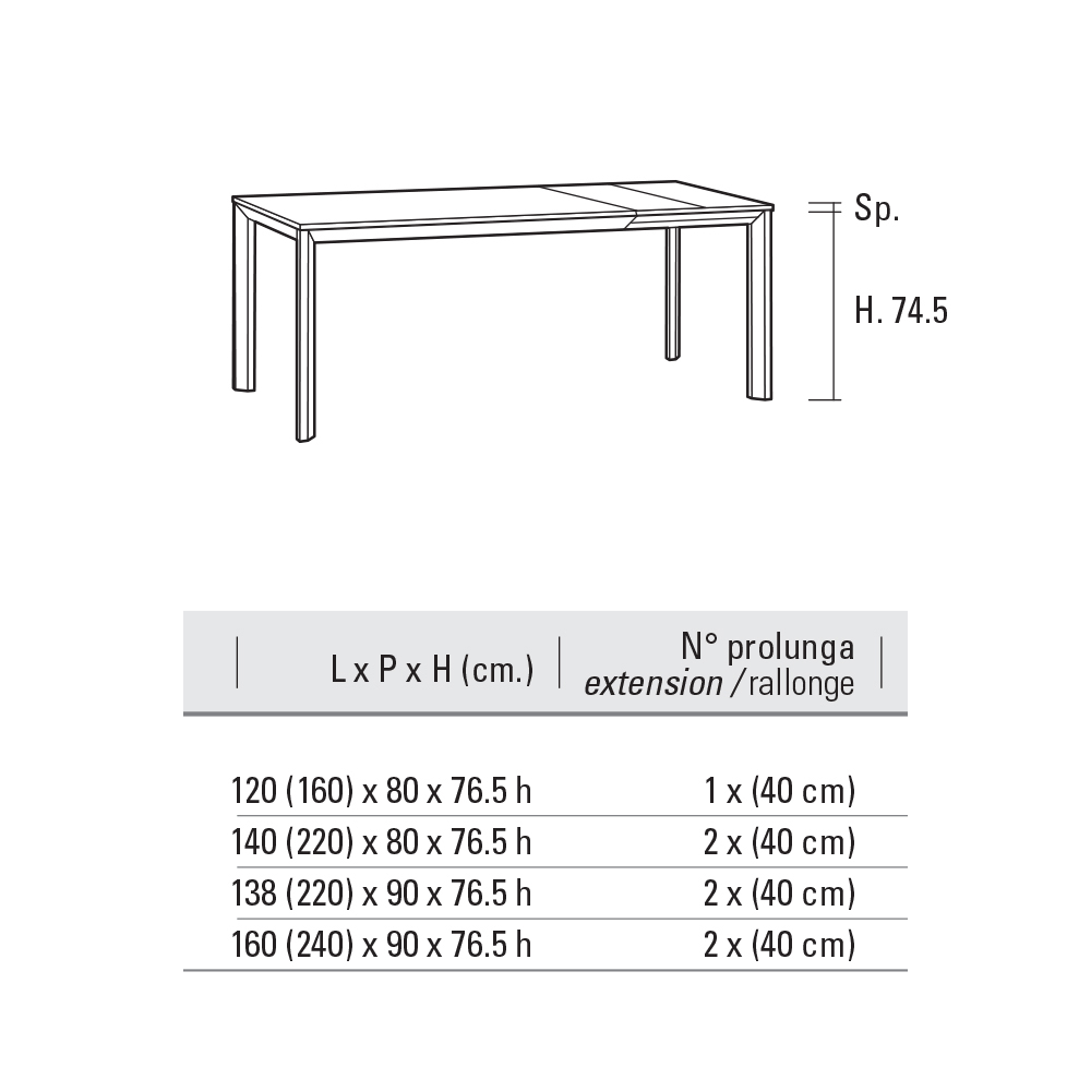 Tailles disponibles:- L 120/160 x P 80 x H 76,5 cm (1 rallonge) ;