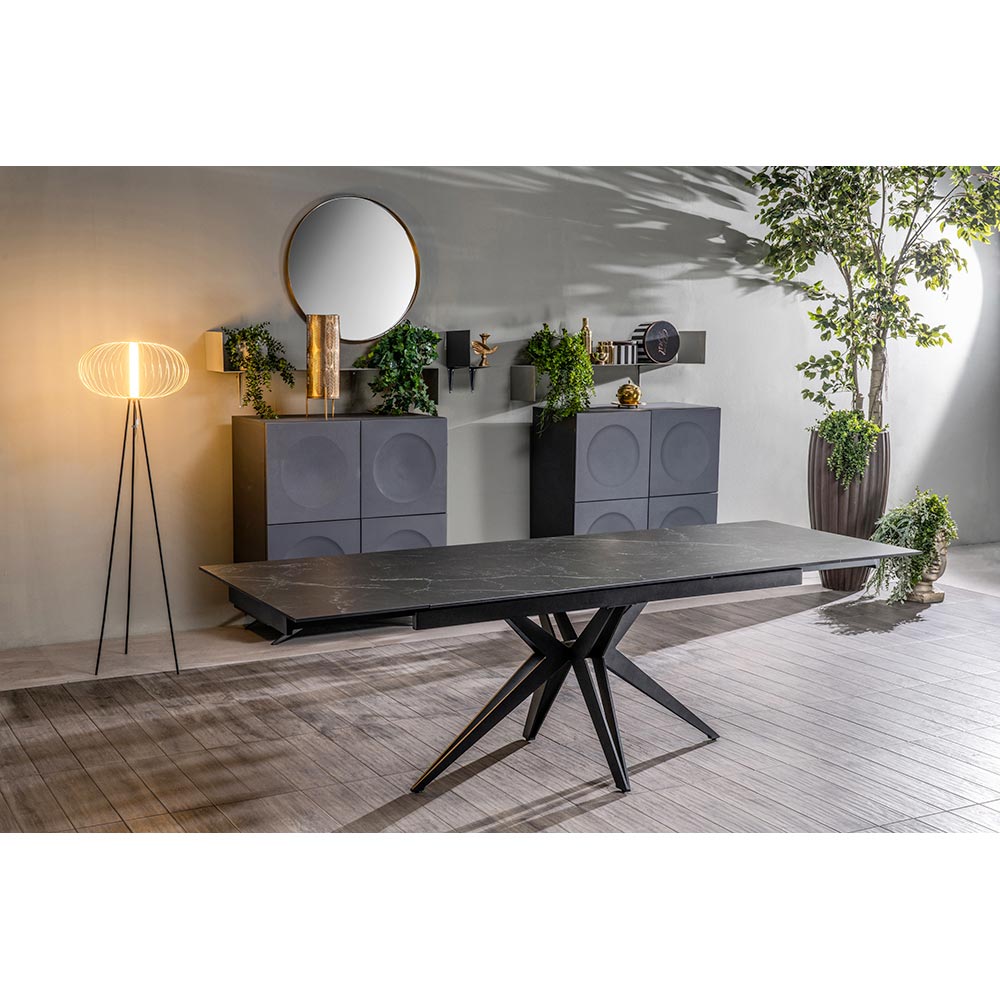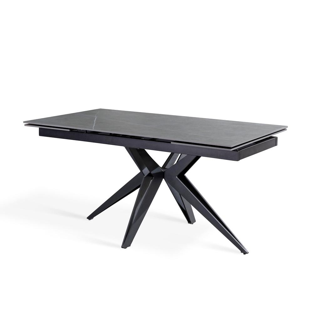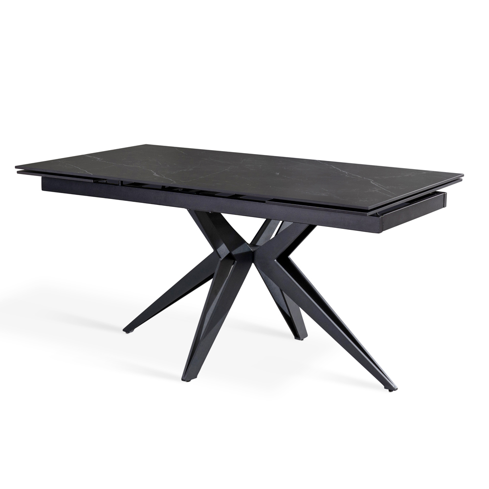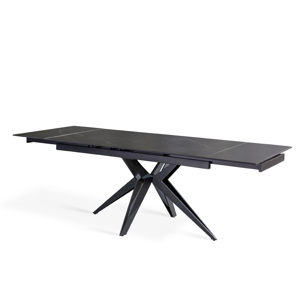 Table de salon extensible avec plateau en céramique , pieds en étoile en métal et rallonges rétractables en céramique.