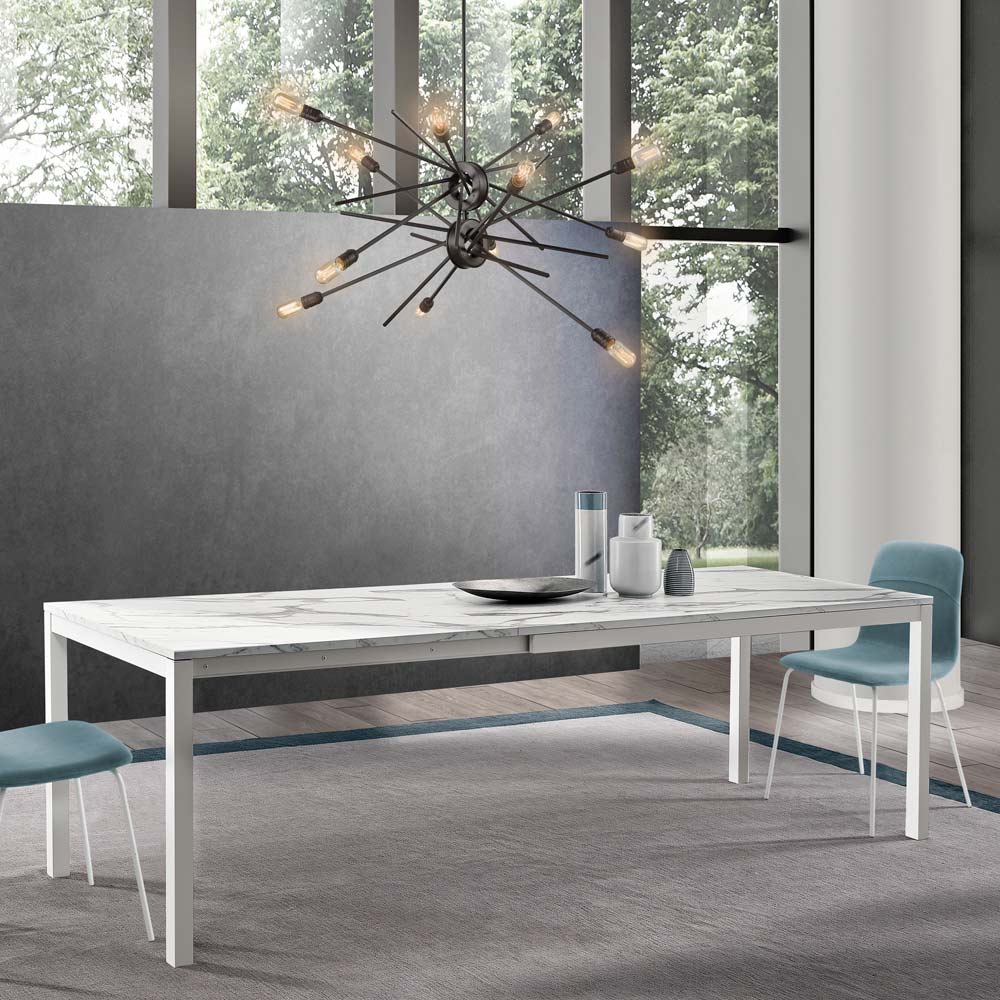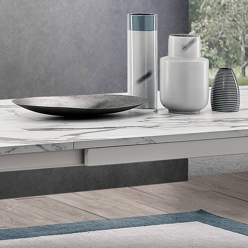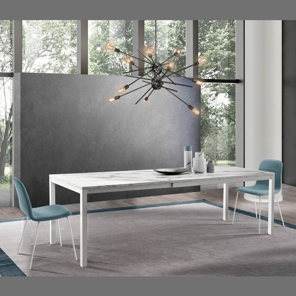 Voici une table à manger qui célèbre l'éclat et la pureté du design moderne. Avec une superbe surface en mélamine effet calacatta , cette pièce rehausse n'importe quelle pièce, alliant la robustesse du matériau à la légèreté visuelle offerte par les pieds en métal blanc . L'apparence est épurée, minimale, mais riche en détails, tels que le grain subtil et naturel qui traverse délicatement la surface, offrant une combinaison parfaite de fonctionnalité et d'esthétique sophistiquée.