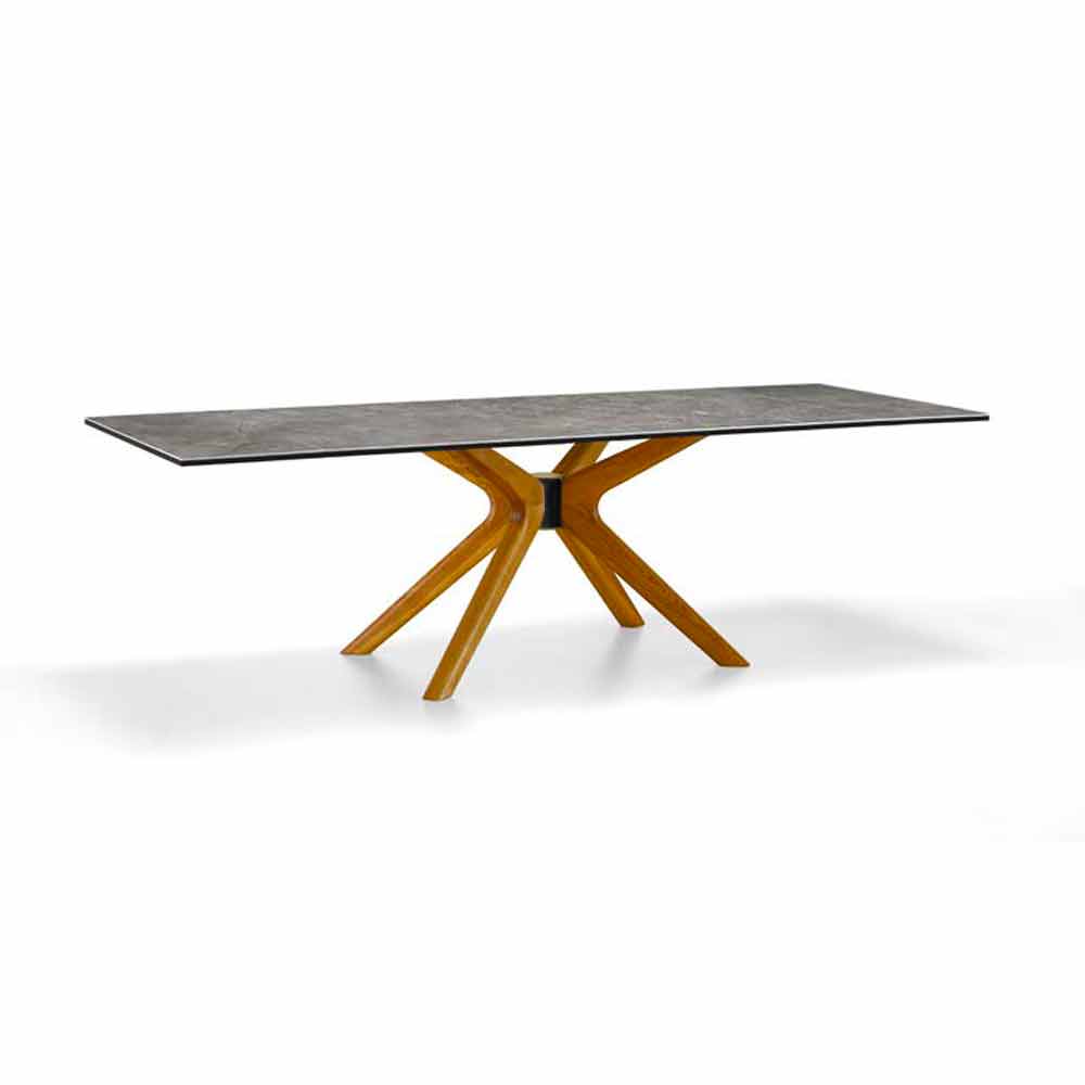 plateau en grès effet marbre de 2 cm d'épaisseur pouvant être rallongé jusqu'à une longueur maximale de 260 cm grâce à la présence de 2 rallonges de tête amovibles de 40 cm qui lui permettent d'accueillir jusqu'à 14 personnes pour les déjeuners et dîners d'entreprise . La structure de ce magnifique meuble est plutôt formée par un support en MDF et une base en bois de frêne huilé finition naturelle qui représente l'élément qui donne solidité et résistance.