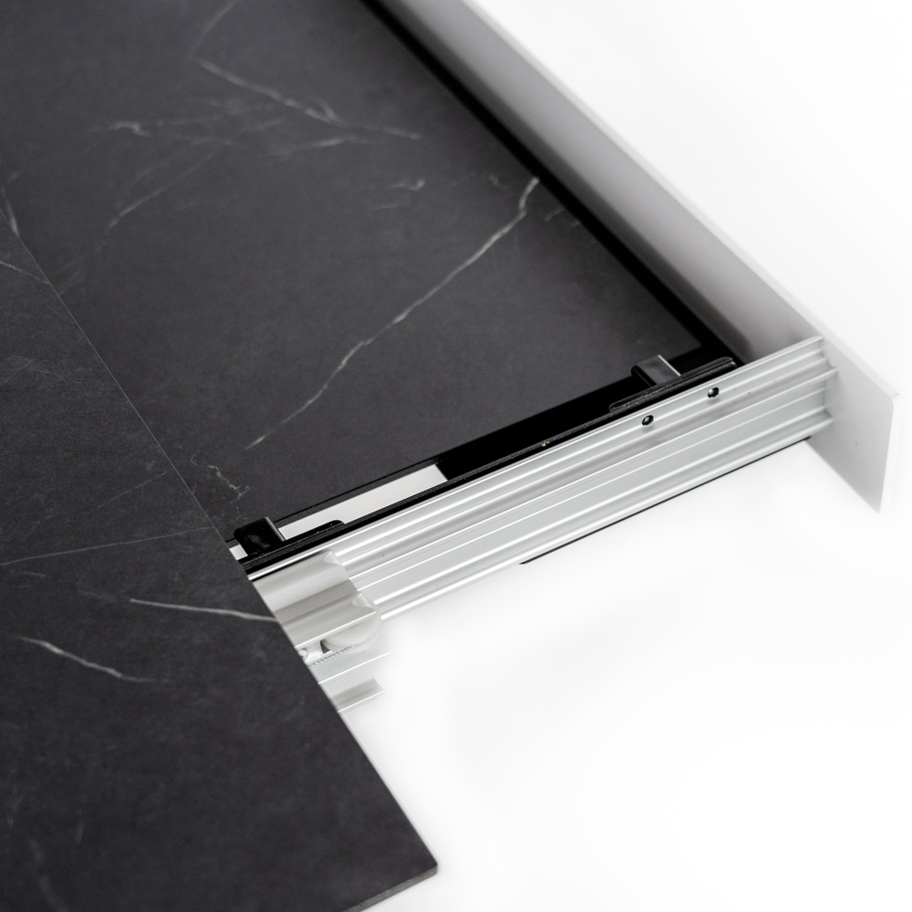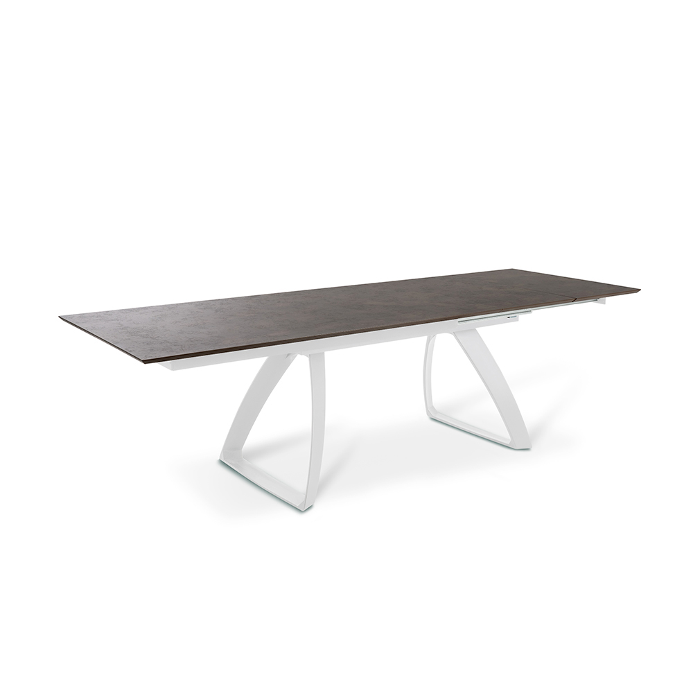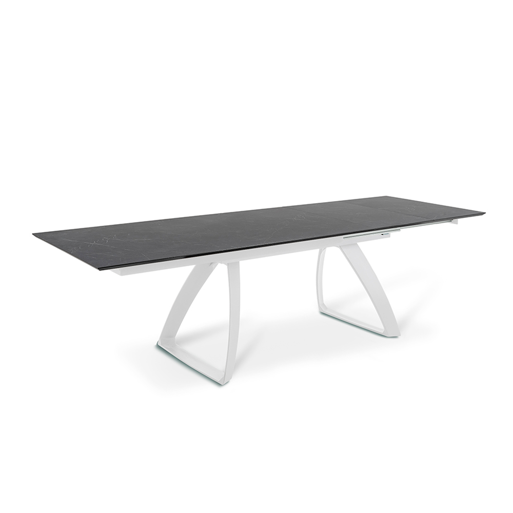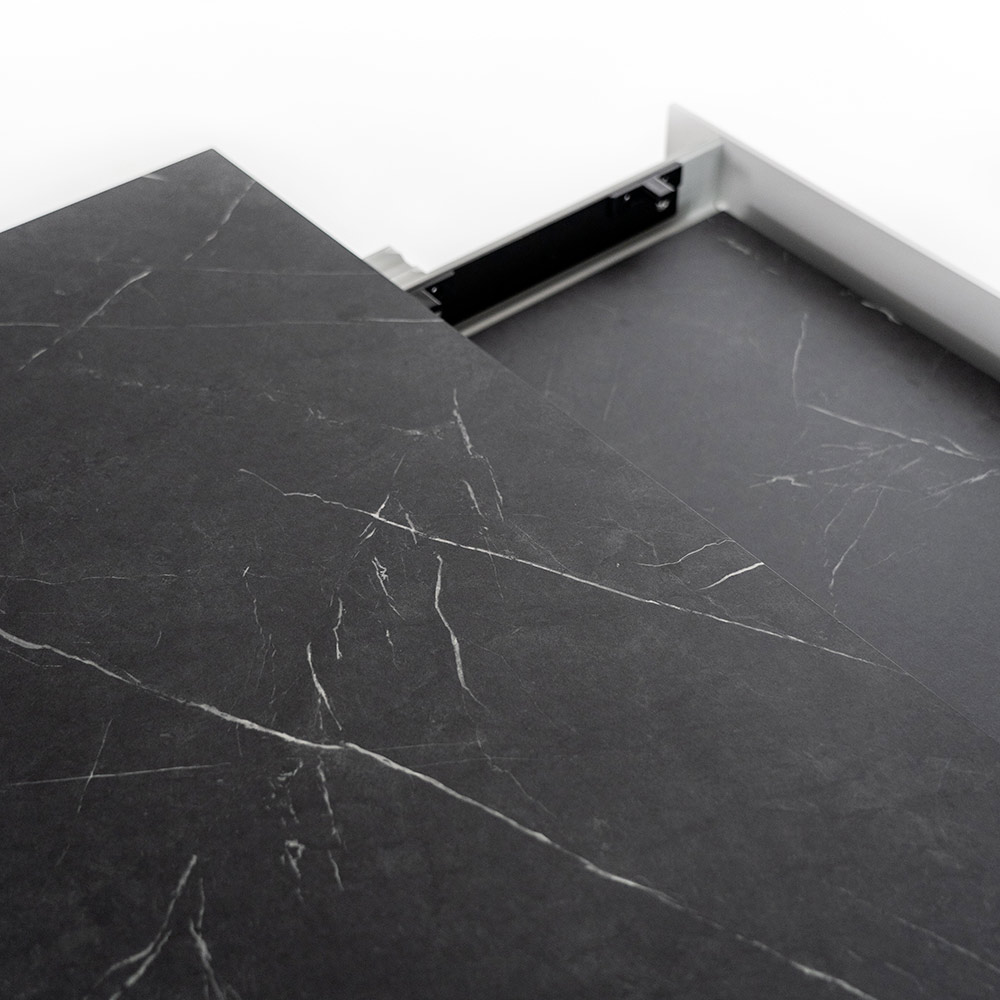 Table de salon extensible avec plateau HPL sur MDF , pieds en aluminium peint blanc ou noiret extensions internes en HPL sur MDF.
