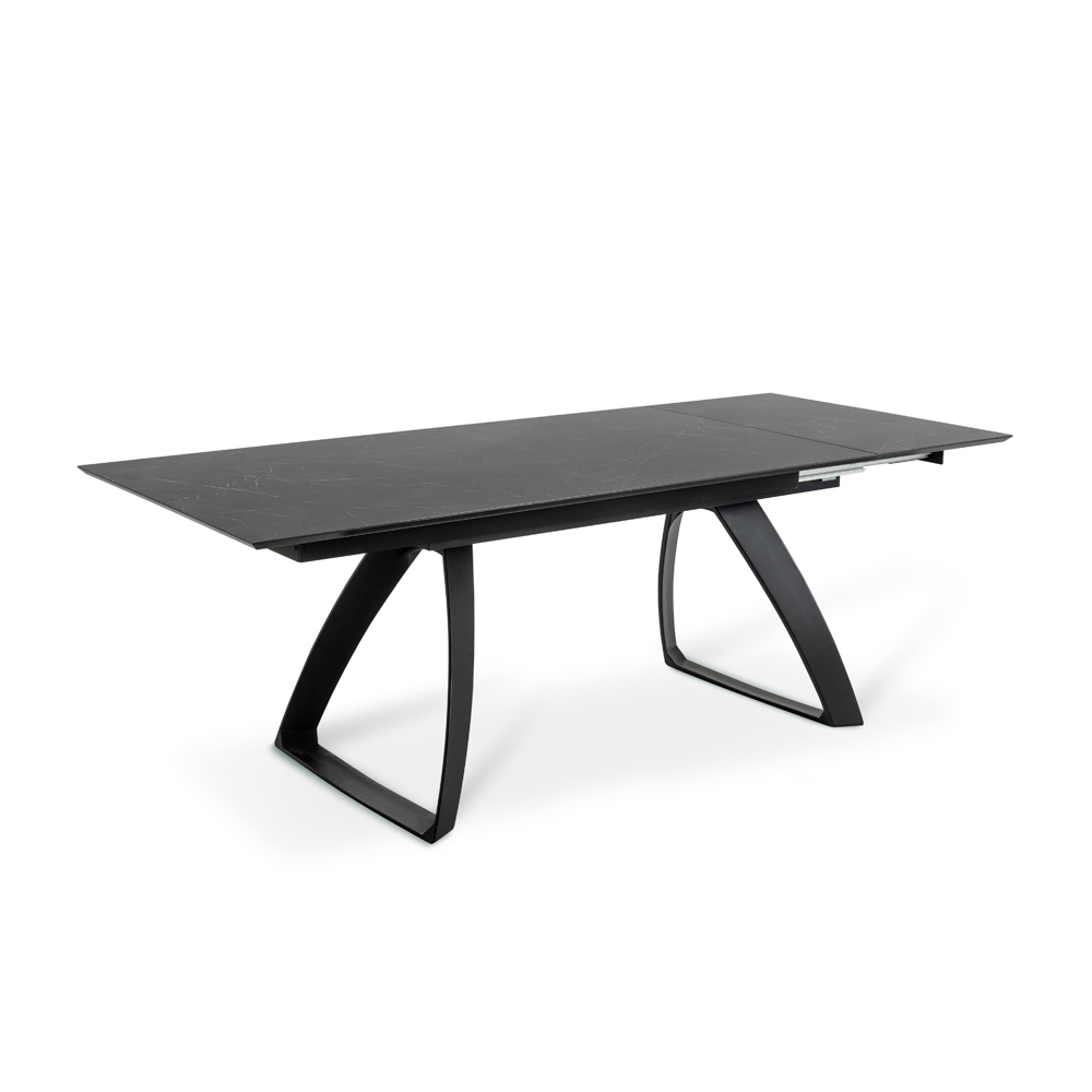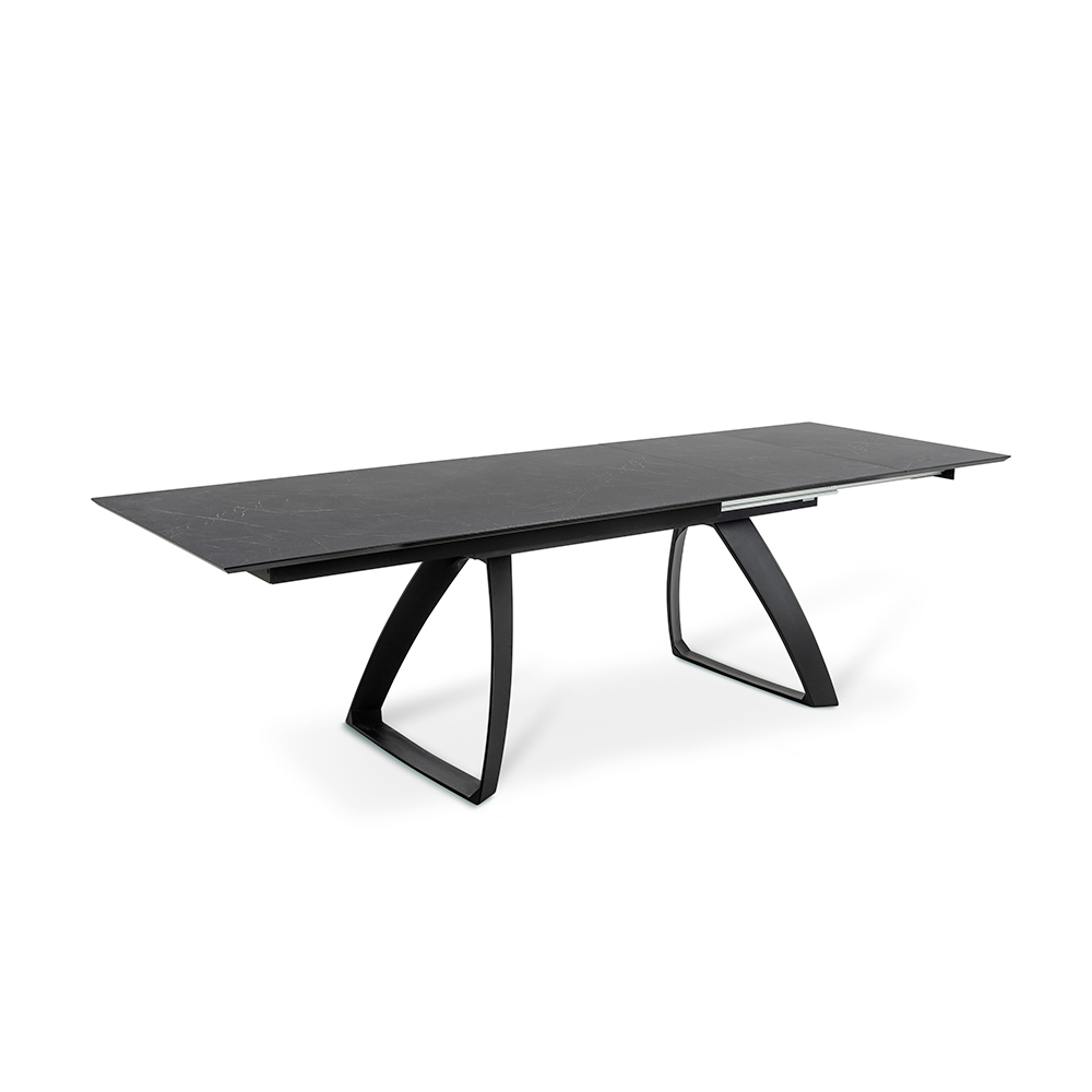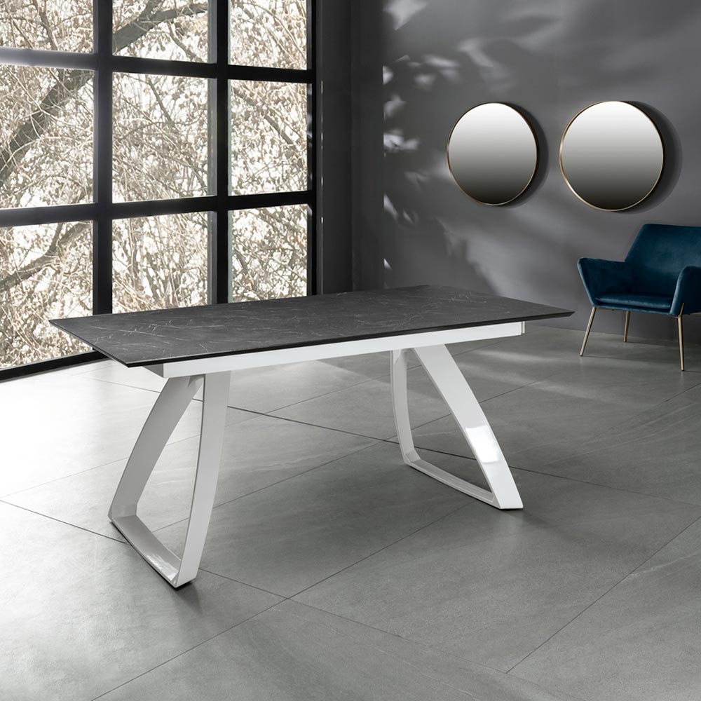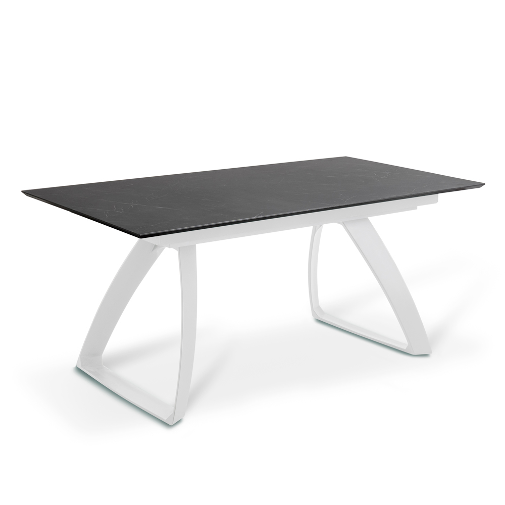 Table de salon extensible avec plateau HPL sur MDF , pieds en aluminium peint blanc ou noiret extensions internes en HPL sur MDF.