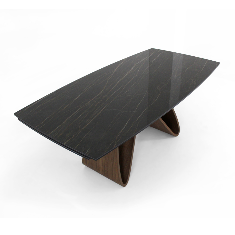 Table tonneau de salon extensible avec rallonges intégrées, plateau en céramique , bord droit , base en placage noyer canaletto et pieds réglables. Grâce à la forme de la base et à la finition du plateau, la table est capable de donner une touche de mouvement et d'élégance à n'importe quel environnement quotidien et contractuel. Les matériaux garantissent fonctionnalité et praticité afin d'avoir un produit non seulement visuellement très beau mais également utilisable en toute occasion.