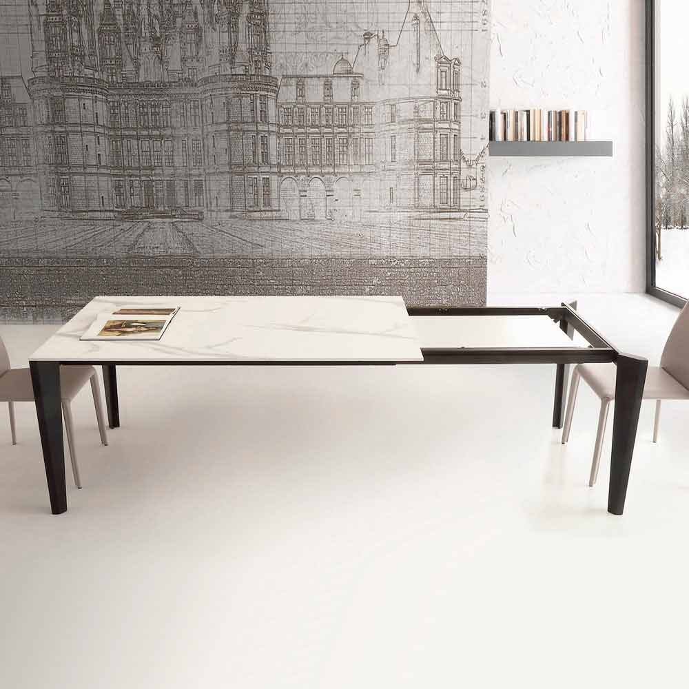 Table à manger fabriquée en Italie avec plateau extensible en vitrocéramique (épaisseur 12 mm) avec finition effet marbre blanc Calacatta, rallonge en mélaminé blanc et base en métal peint noir.