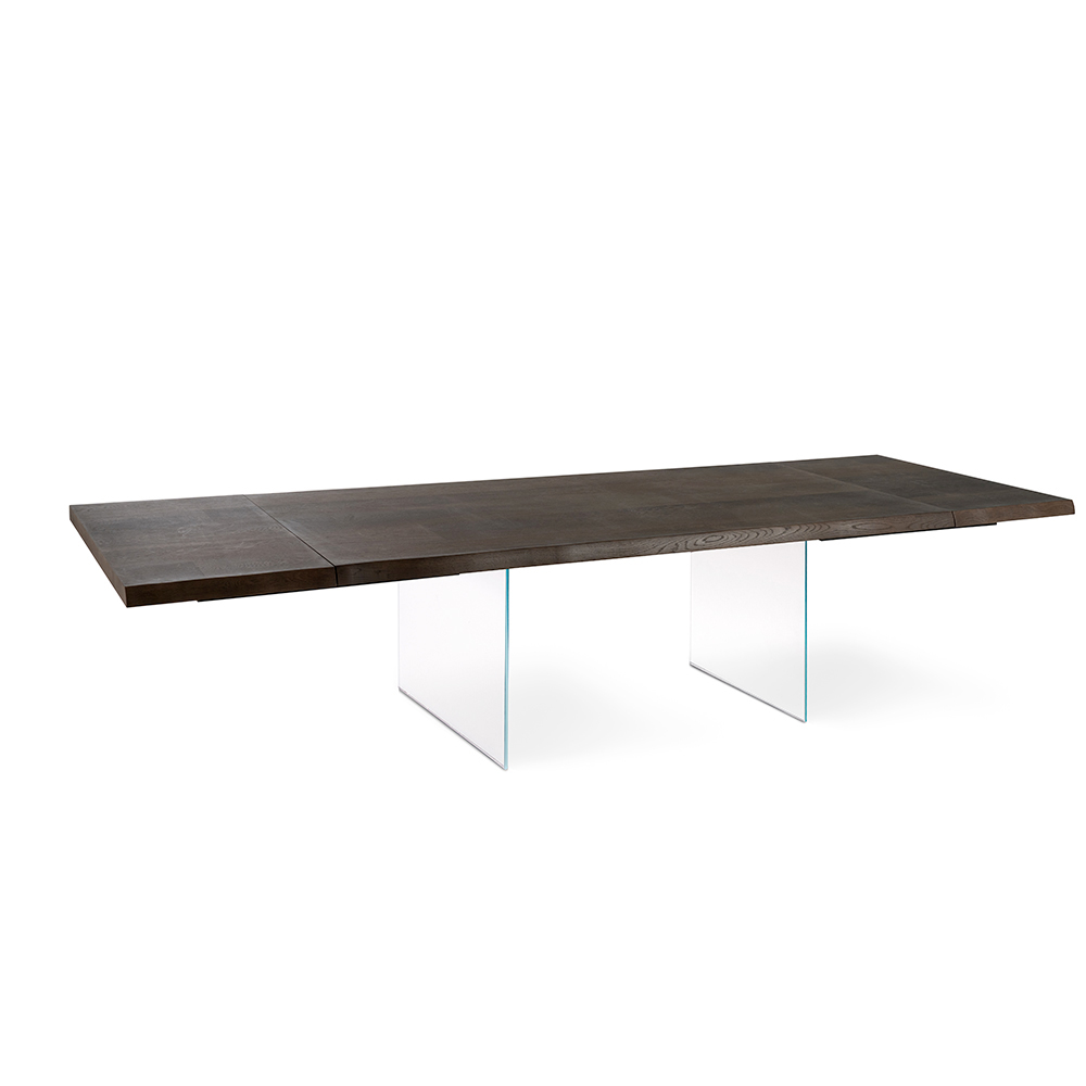 Table de salon extensible avec plateau en chêne plaqué , pieds en verre trempé extra transparent et rallonges externes plaquées.
