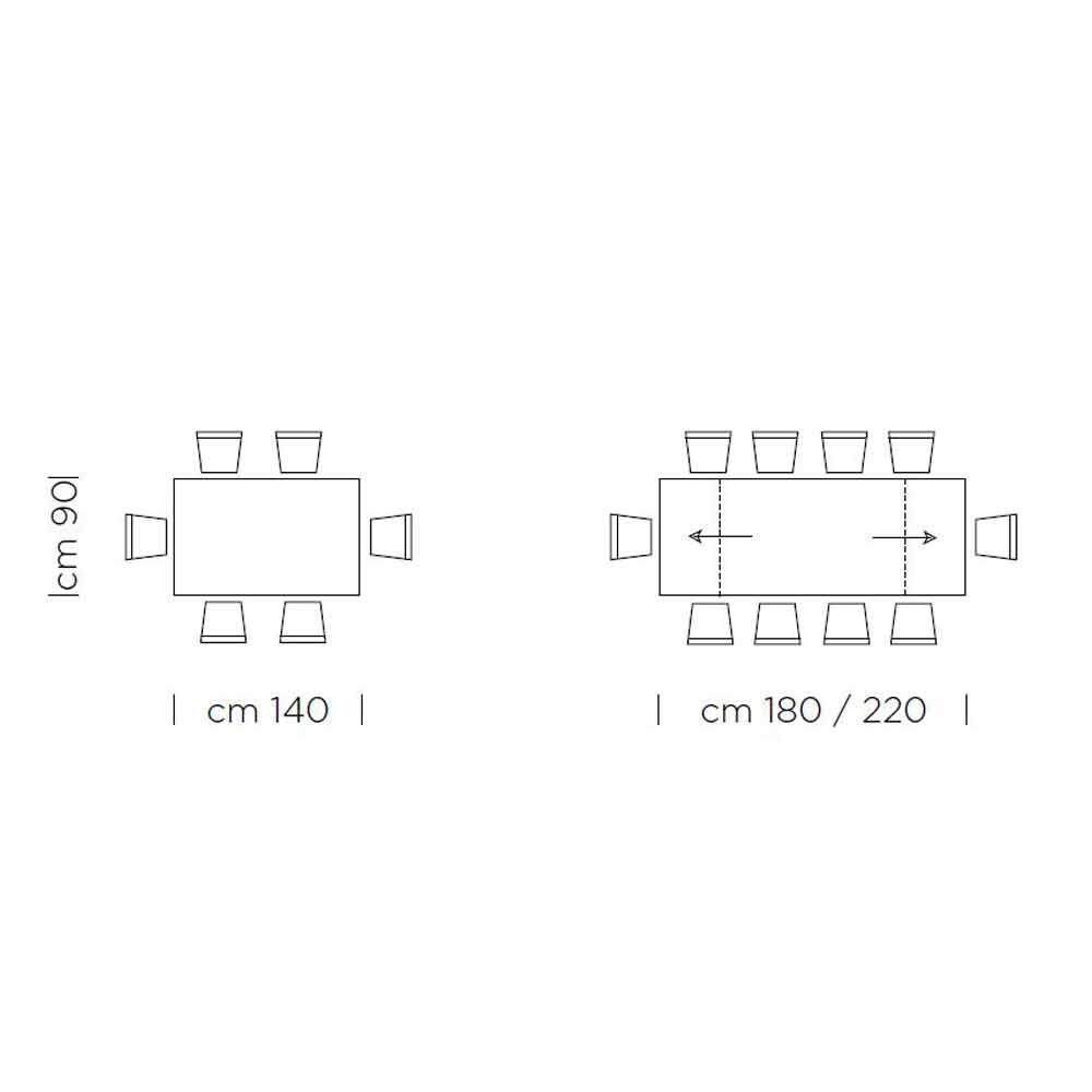 - L 140/220 x P 90 x H 75,5 10 places (2 rallonges de 40 cm) ;