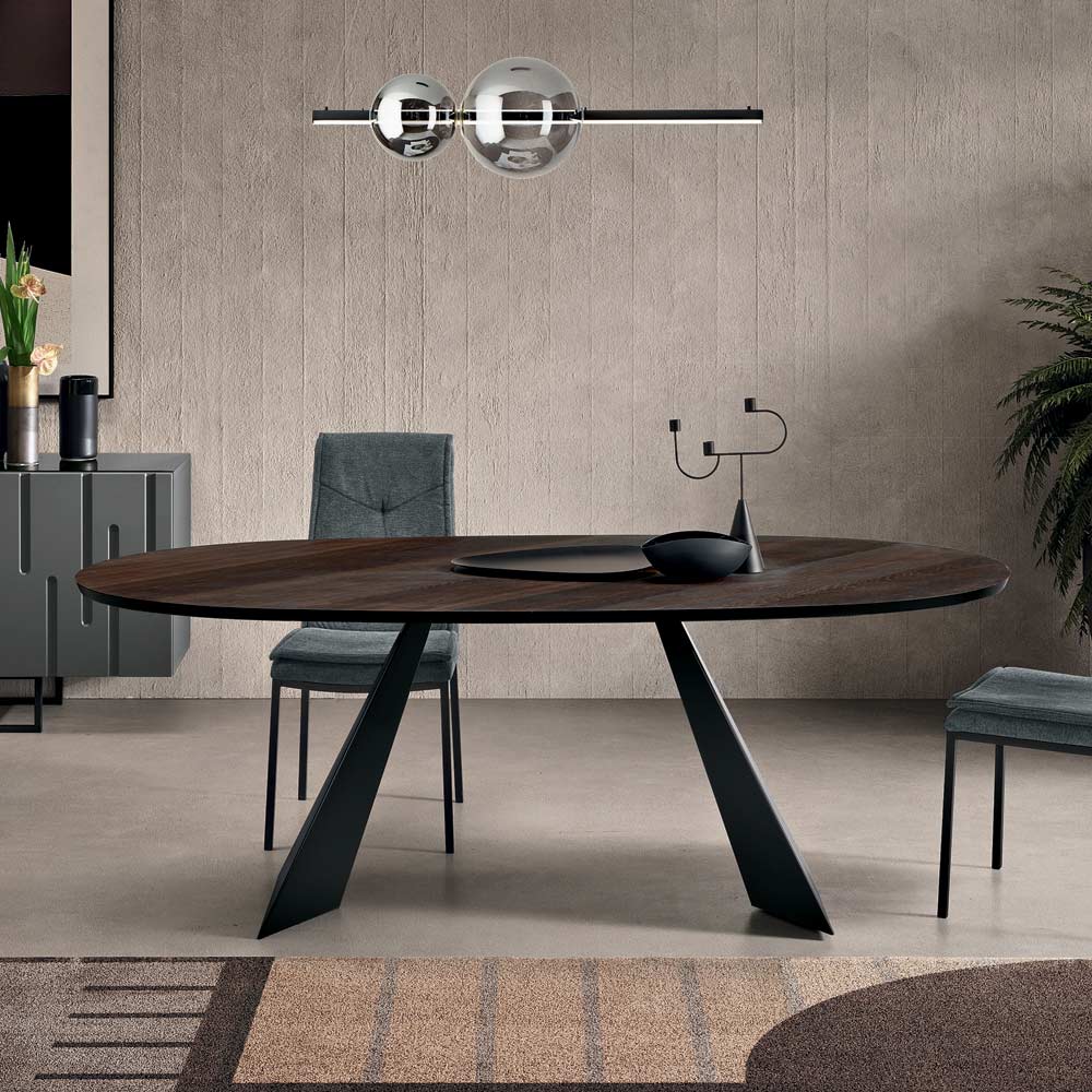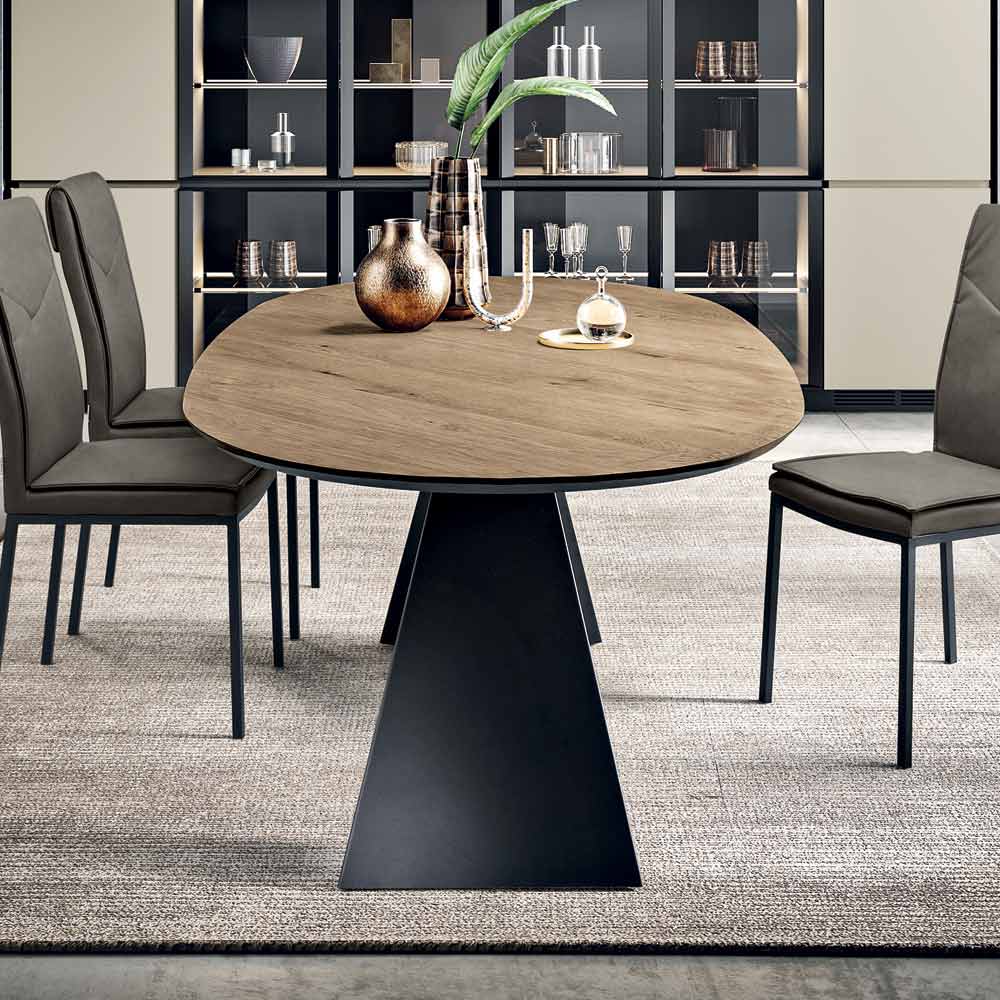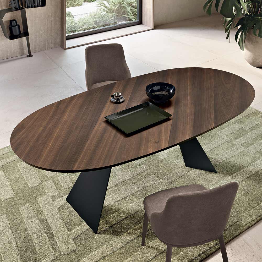 Une table à manger design élégante, fabriquée en Italie , conçue pour meubler avec style votre salle à manger ou votre salon . Cette table réinterprète le design essentiel du modèle Gilmour avec un plateau ovale raffiné en placage chêne , un choix qui adoucit les lignes et favorise la convivialité sans angles saillants.