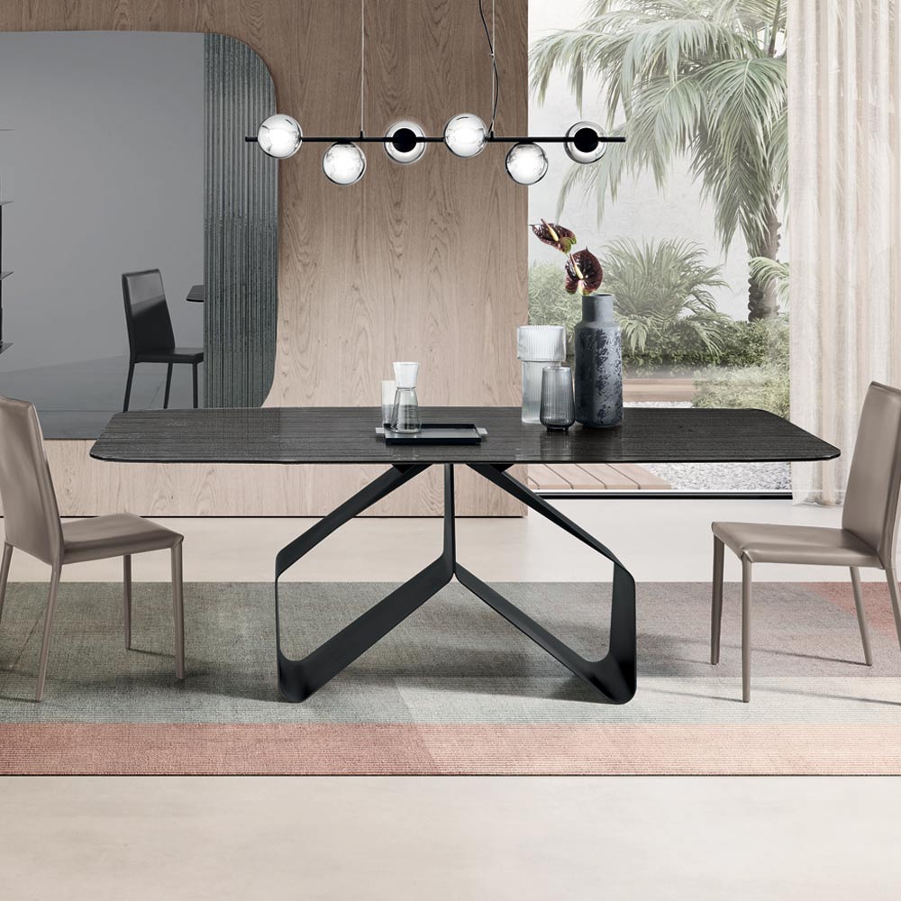 Une élégante table à manger design, fabriquée en Italie, conçue pour meubler avec style votre salle à manger ou votre salon . Elle se distingue par son piètement original en métal peint , orné d'une structure graphique légère et dynamique évoquant deux ailes stylisées, créant un impact esthétique fort tout en préservant un bel équilibre visuel.