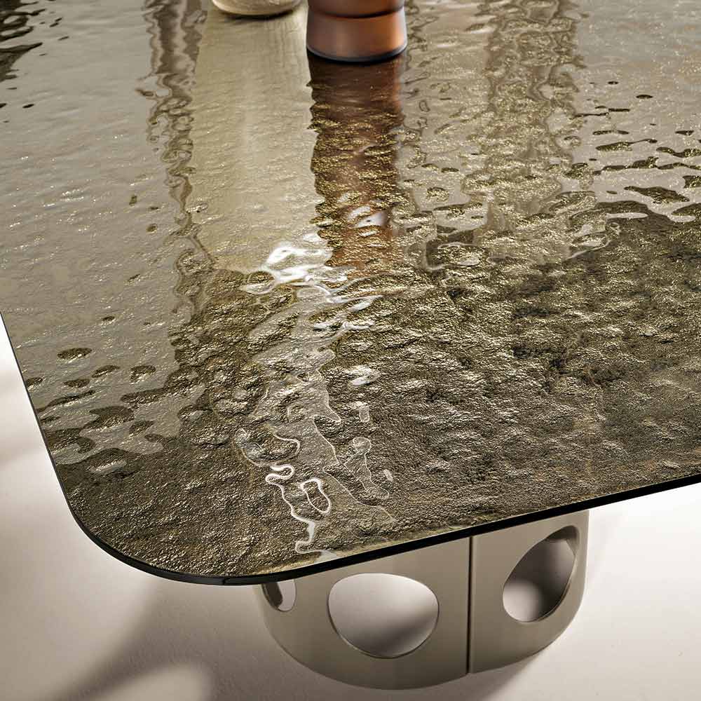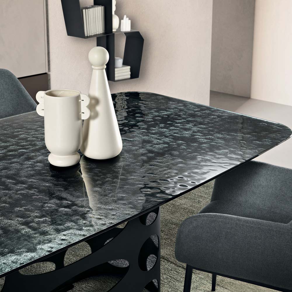 Le plateau en verre martelé confère à la table profondeur et personnalité grâce à sa texture unique qui reflète la lumière de façon irrégulière, créant ainsi des effets visuels saisissants. Ce procédé rend chaque surface dynamique et raffinée, sublimant le design contemporain du produit.