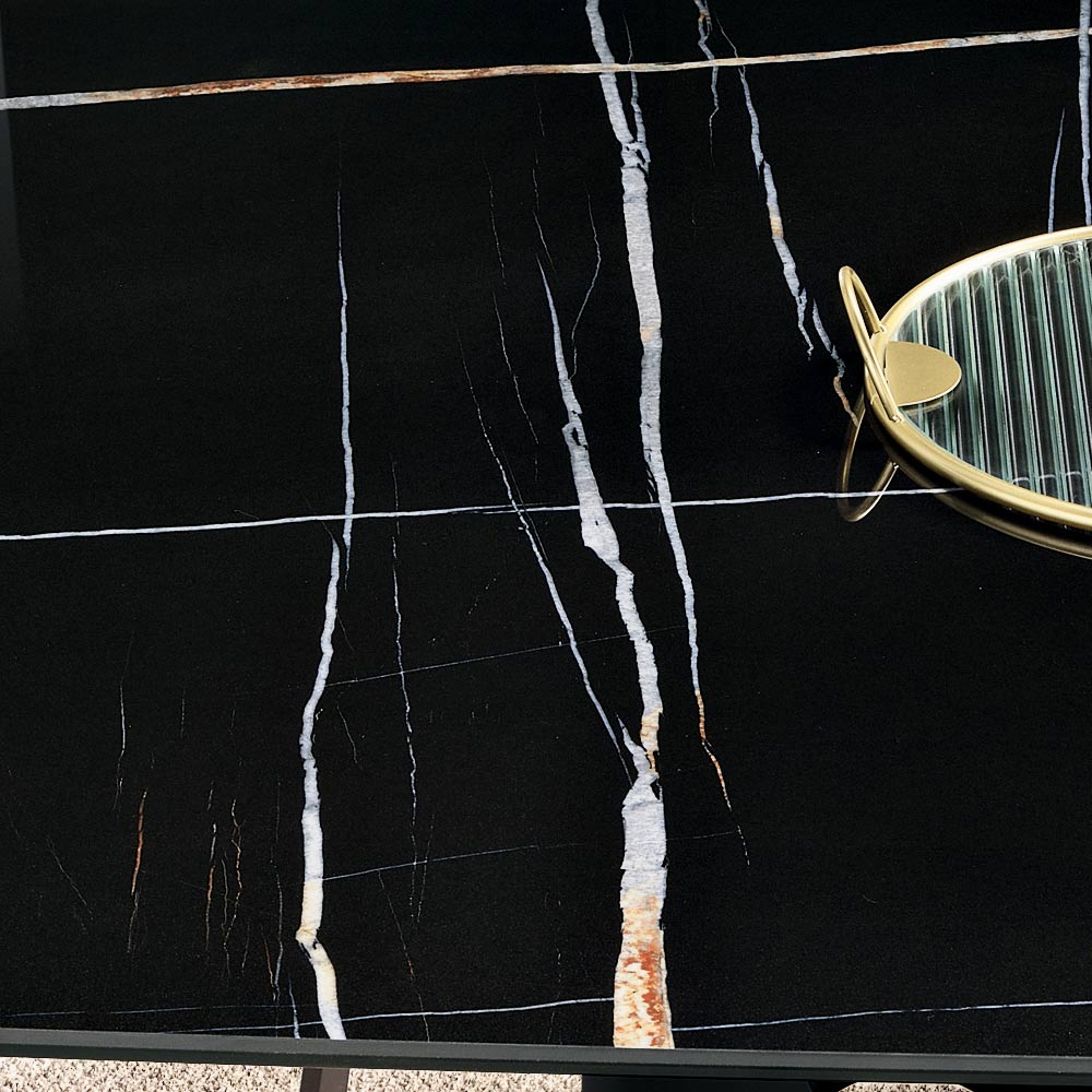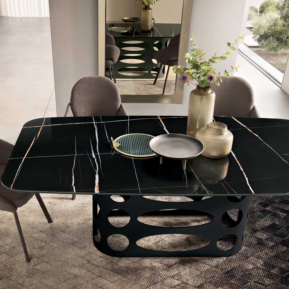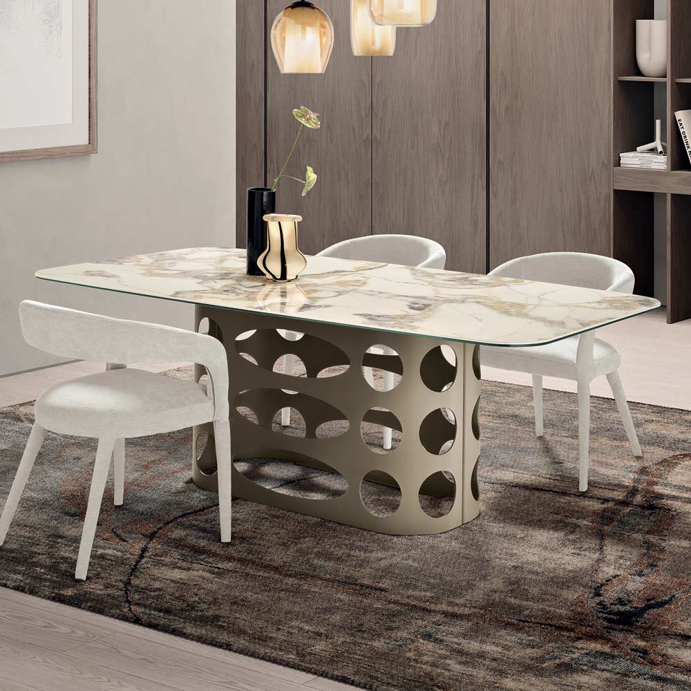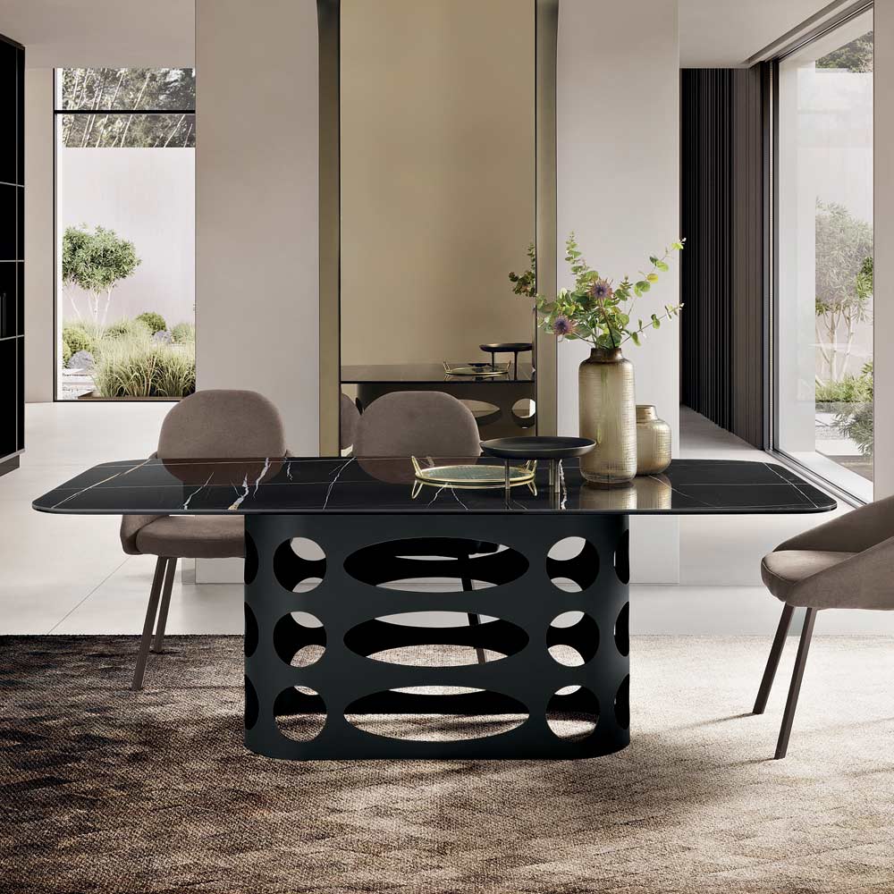 Grâce à l'alliance de la matière céramique et du design perforé du piètement, cette table représente une solution raffinée et contemporaine capable de sublimer n'importe quelle pièce de la maison, devenant ainsi la véritable pièce maîtresse de l'espace repas.