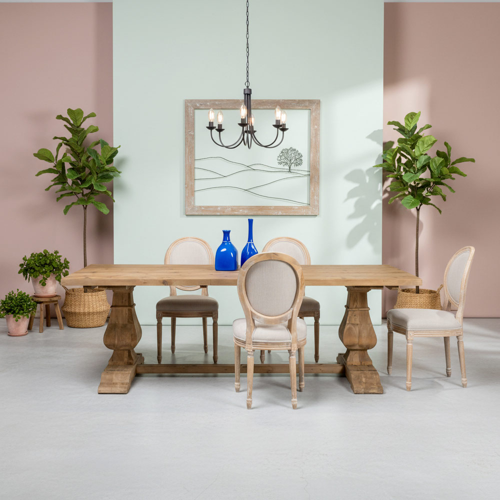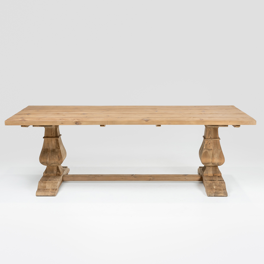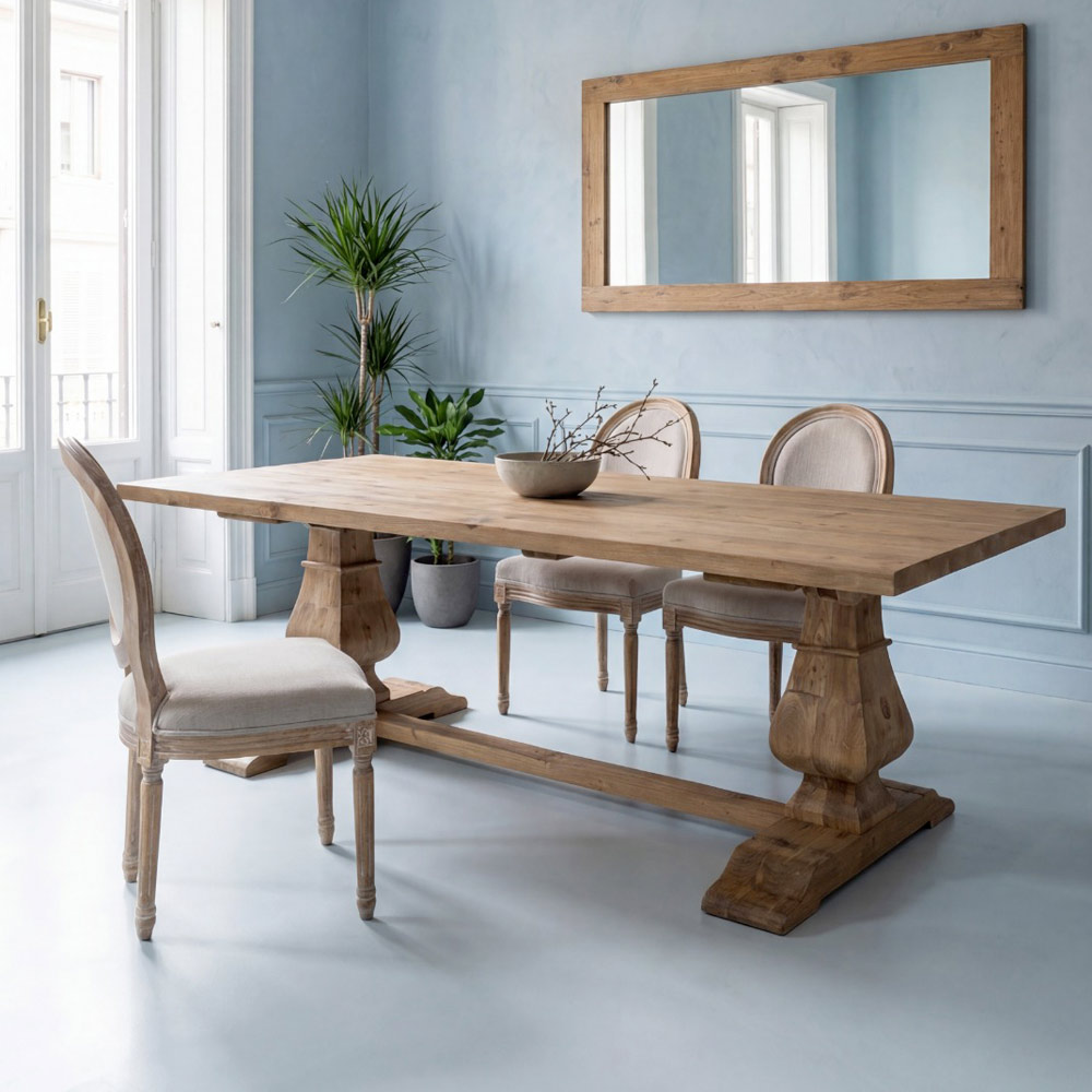 Cette table en pin vieilli naturel possède un charme authentique et intemporel, idéale pour sublimer les grands espaces comme les salles à manger ou les salons. Sa finition vieillie met en valeur la texture du bois, révélant le grain, les nœuds et les imperfections qui rendent chaque table unique.