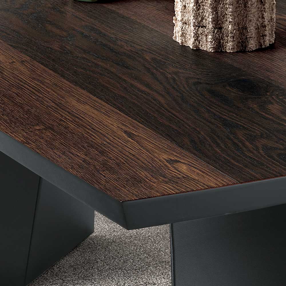 L'alliance du métal et du bois crée un contraste élégant et contemporain, rendant cette table adaptée à différents styles d'ameublement. Le plateau est disponible en chêne brut et en chêne traité thermiquement , des finitions conçues pour sublimer la beauté naturelle du bois et s'intégrer harmonieusement aux intérieurs modernes.