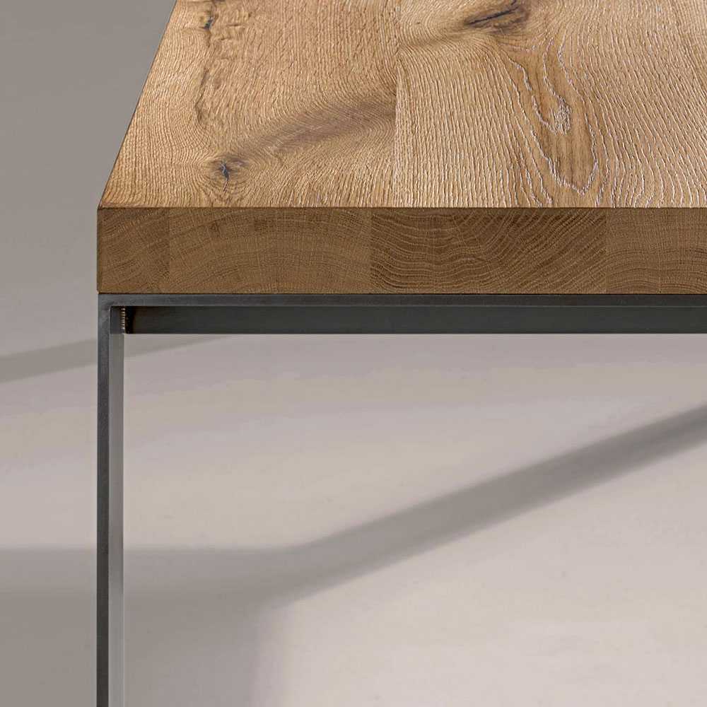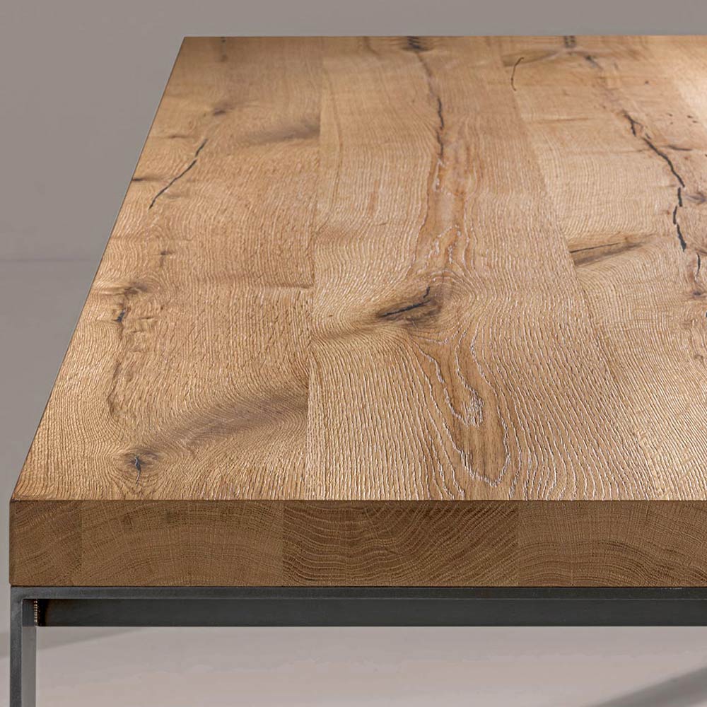 Table fixe plaquée sur panneaux de particules de peuplier fendu de chêne naturel avec piedsen métal finition fer . Dimensions H 78 cm, épaisseur 6 cm.