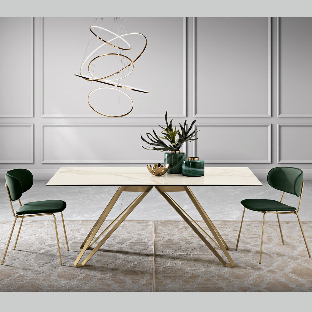 Superbe par son contraste de matériaux et de couleurs, cette table est une véritable expression du luxe et du design moderne. Le plateau en vitrocéramique effet marbre calacatta aux nuances délicates est une célébration de l'élégance naturelle, résistante et en même temps extrêmement raffinée.