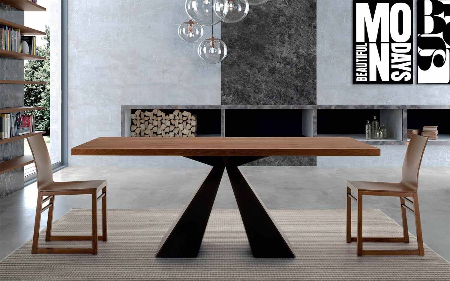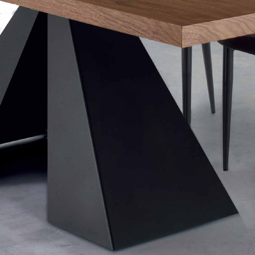 Table de cuisine design en bois plaqué noyer et piètement en acier noir fabriquée en Italie.