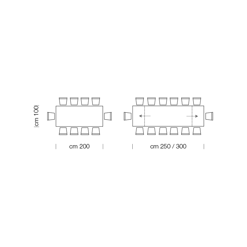 L 200 (300) x P 100 x H 76,5 cm 14 places extensibles par 2 rallonges extérieures de 50 cm.
