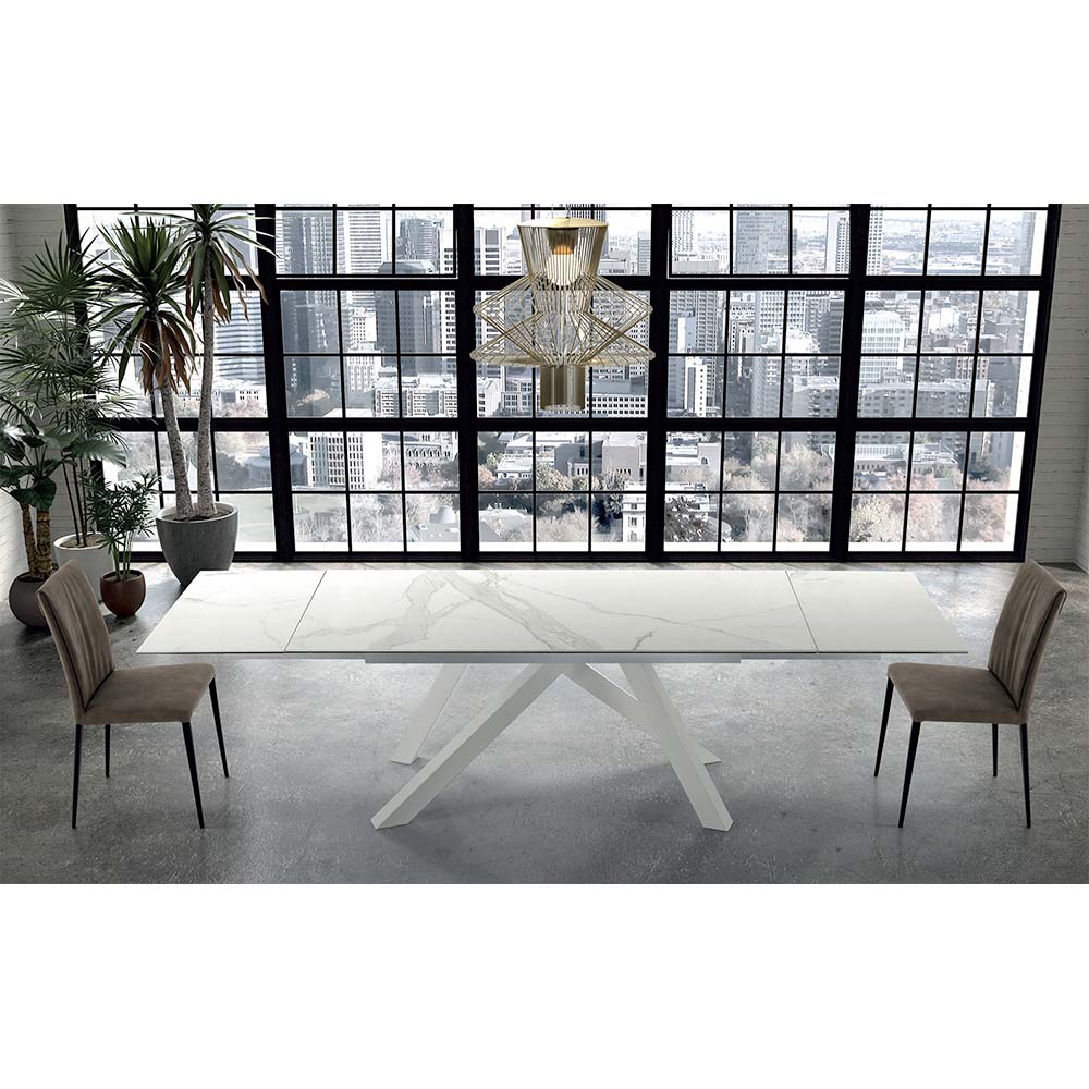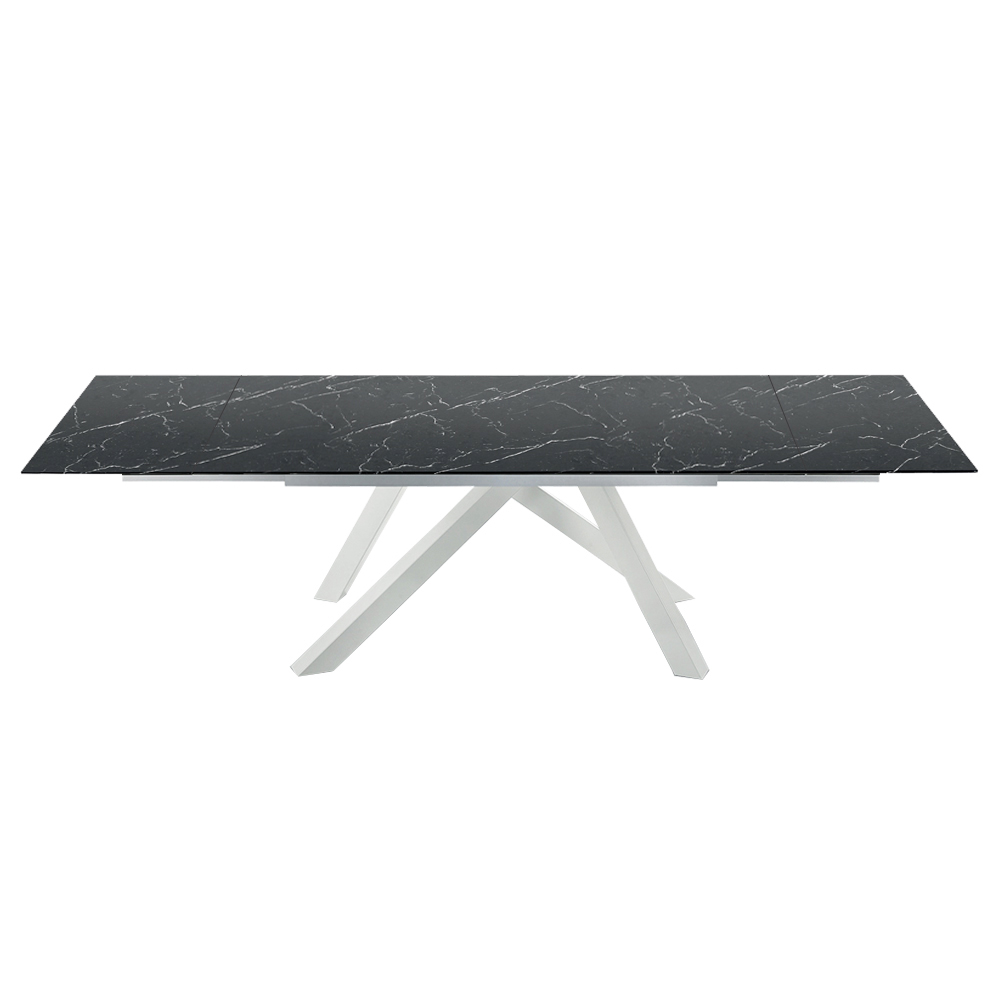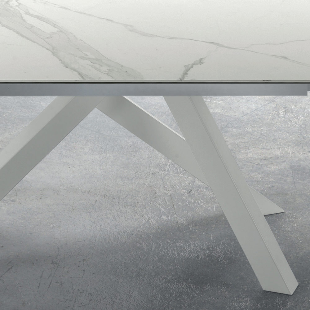 Table Laminam extensible jusqu'à 278 cm avec base en acier blanc ou graphite, produite en Italie.