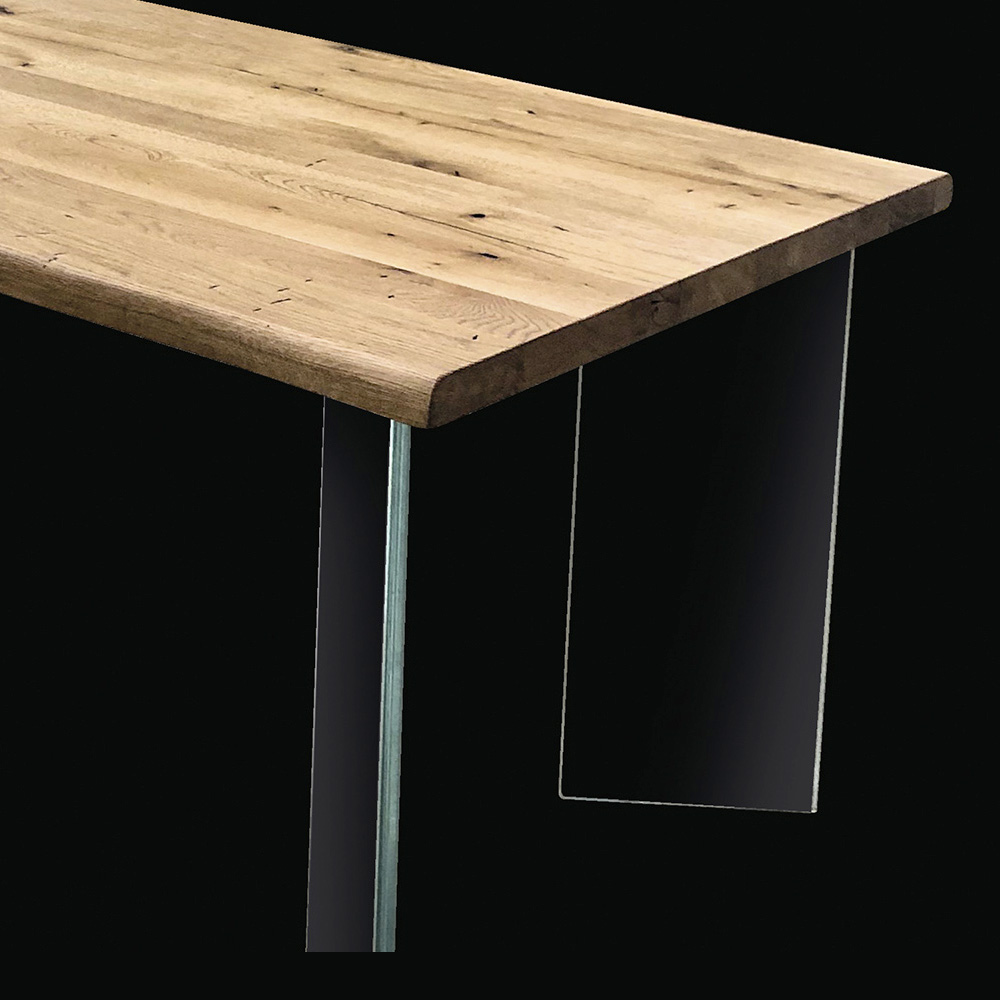 Table en bois plaqué chêne noué et base en cristal Made in Italy.