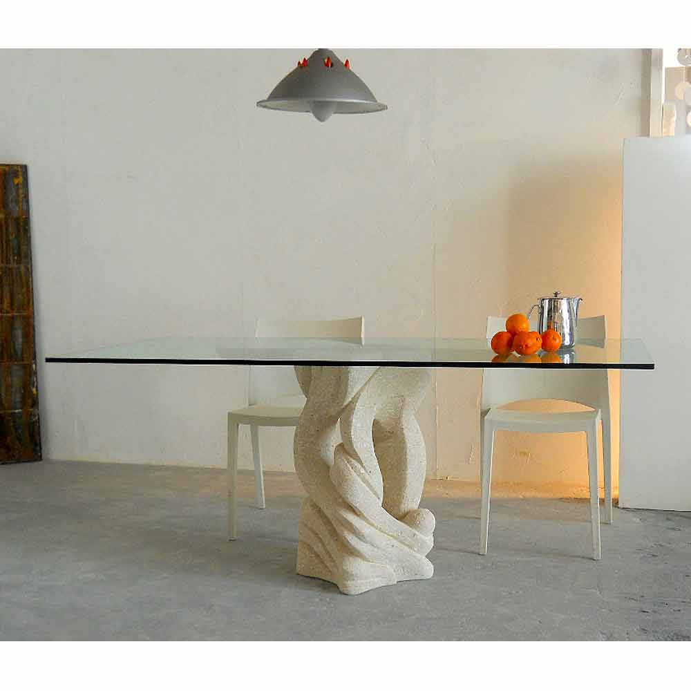 Table rectangulaire avec base en pierre et plateau en cristal Ascanio