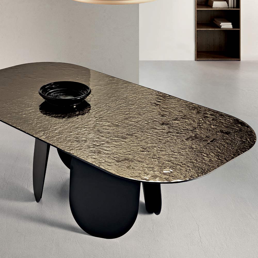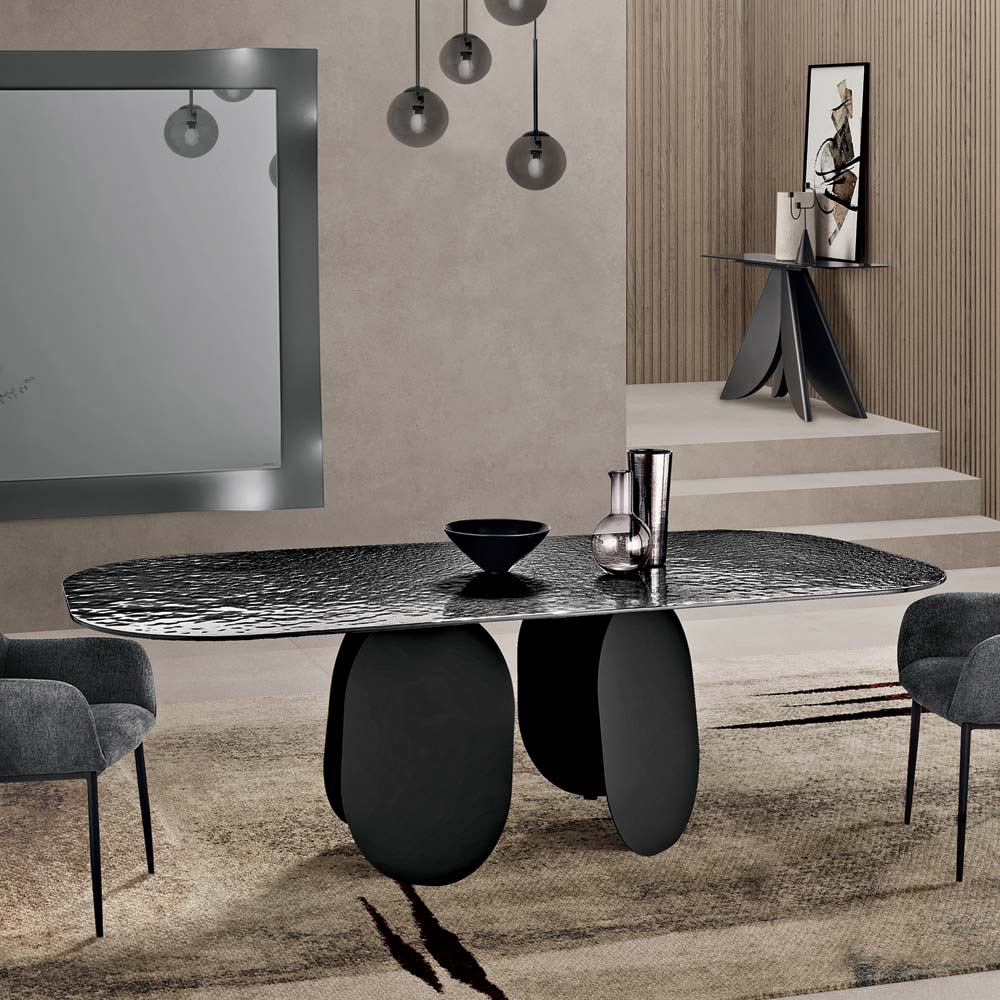 Le plateau en verre martelé argenté au dos apporte luminosité et profondeur visuelle grâce à sa surface texturée qui reflète la lumière avec des reflets irisés. Les angles arrondis du plateau adoucissent les lignes de la table, la rendant plus accueillante et idéale pour les moments conviviaux.
