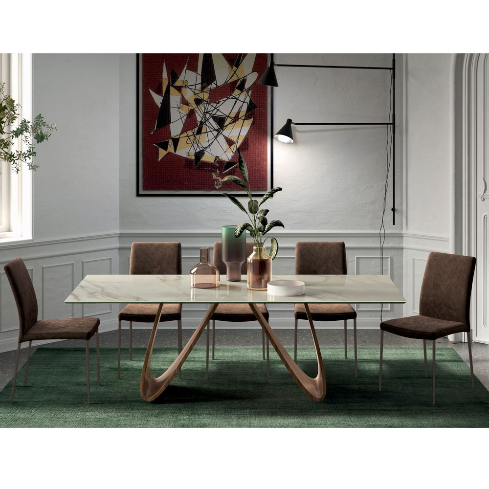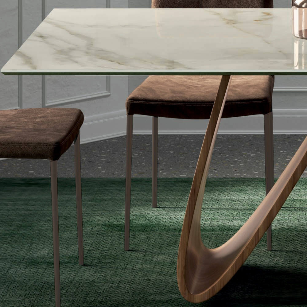 Table de salon fixe avec plateau en céramique , bord biseauté à 45° , base en bois plaqué noyer Canaletto et pieds réglables. Grâce à la forme de la base et aux finitions du plateau disponibles, la table est capable de donner une touche de mouvement et d'élégance à n'importe quel environnement quotidien et contractuel. Les matériaux garantissent fonctionnalité et praticité afin d'avoir un produit non seulement visuellement très beau mais également utilisable en toute occasion.