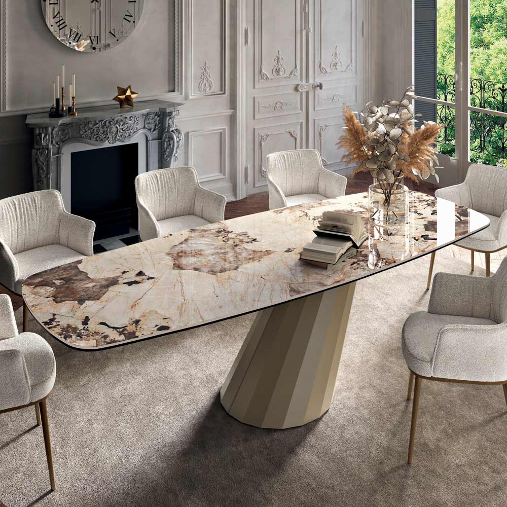 Table de salon fixe en forme de tonneau avec plateau en céramique , bord biseauté à 45° , base en acier laqué champagne et pieds réglables Made in Italy. Ce produit dégage une grande élégance et devient le protagoniste de n'importe quel environnement . Le raffinement de la forme de la base combiné à la finition du plateau que vous choisissez crée une table unique, avec un grand impact visuel qui meuble les environnements quotidiens et contract avec goût et raffinement . Le choix de matériaux de première qualité et l' attention portée à la création de chaque détail créent un produit d' excellente qualité Made in Italy.