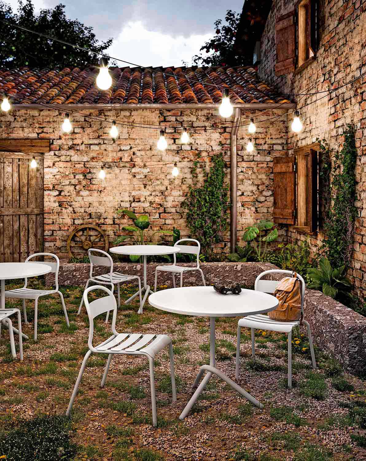 Table de jardin ronde au design innovant et moderne réalisée avec une structure métallique tubulaire qui se démarque grâce à la particularité des pieds entrelacés qui la rendent robuste et solide à la fois. Le plateau est plutôt en tôle disponible en 6 variantes de couleurs et en deux diamètres différents, ce qui lui permet de s'adapter à n'importe quel environnement donnant de la couleur et de la vivacité. C'est un article qui peut être facilement replié et empilé horizontalement, permettant ainsi d'optimiser au mieux les espaces.