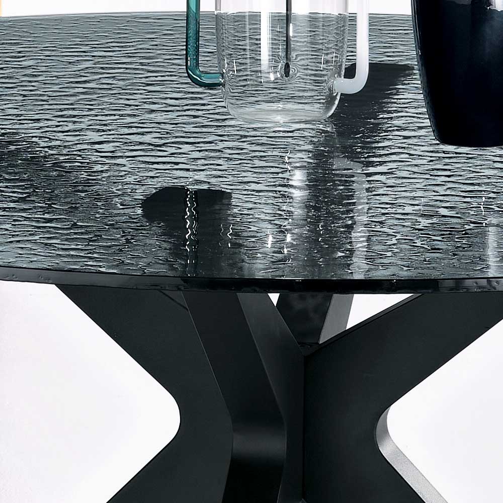 Une élégante table à manger ronde au design contemporain, idéale pour apporter une touche de style à votre salle à manger ou votre salon . Son plateau en verre martelé fumé offre une finition raffinée qui crée un effet texturé unique et donne de la profondeur à l'espace.