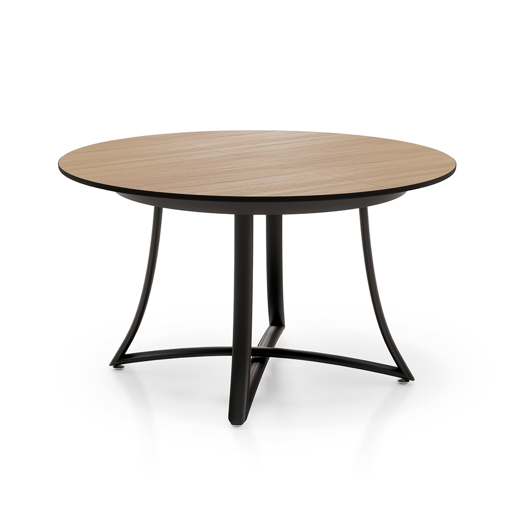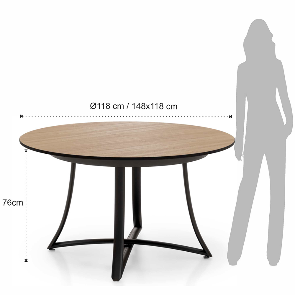 Cette table ronde extensible est un parfait exemple de design moderne alliant fonctionnalité et style. Dotée d'un plateau en bois, cette table véhicule une ambiance chaleureuse et accueillante, tandis que le piètement en métal noir offre un fort contraste visuel qui ajoute une touche d' élégance contemporaine à l'ensemble.