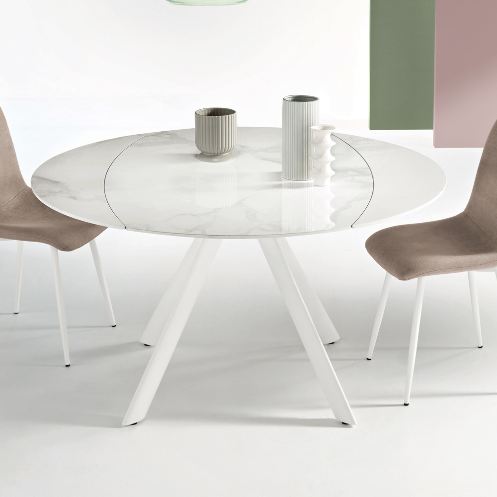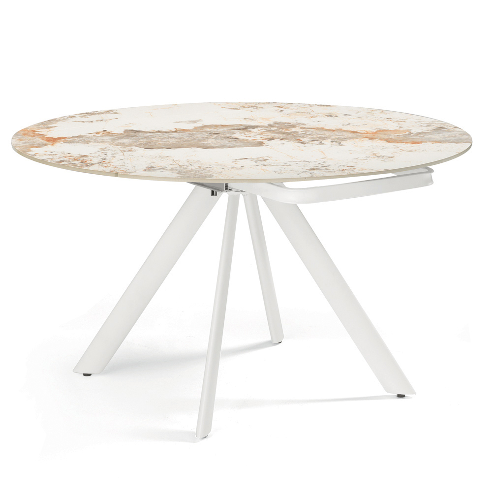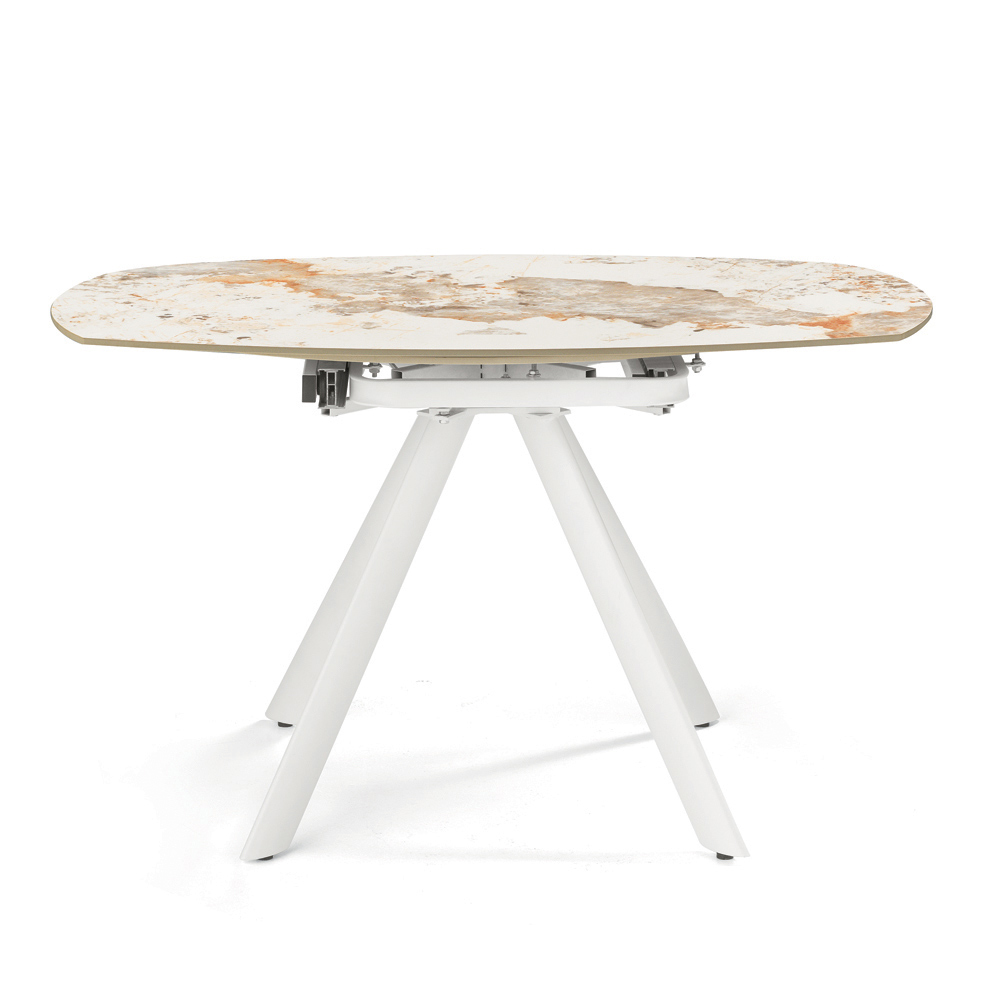 Élégante table de salle à manger extensible conçue pour aménager avec style votre salon ou votre salle à manger . Son plateau en pierre frittée effet marbre offre une surface durable, raffinée et facile d'entretien, idéale pour un usage quotidien.