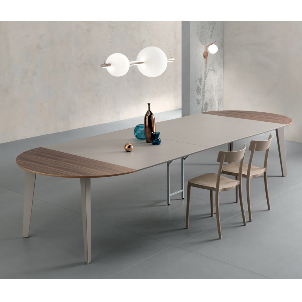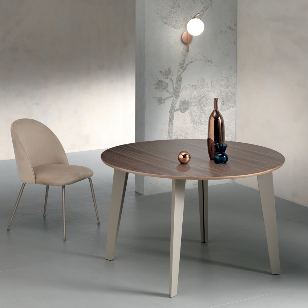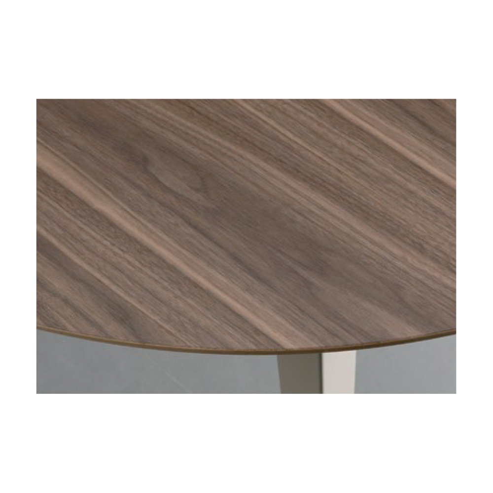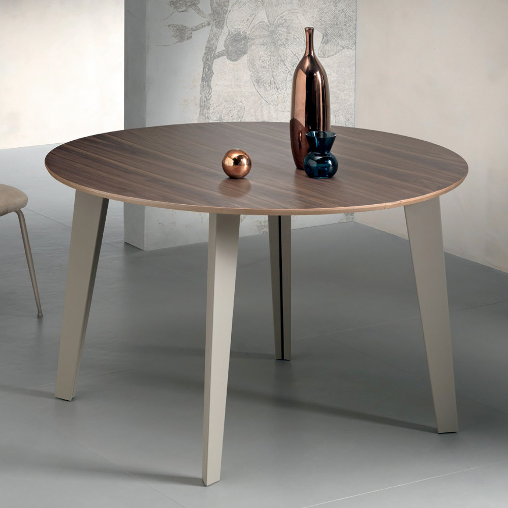 Table ronde, diamètre 120 cm, extensible à 276 ou 380 cm, avec plateau en placage de noyer Canaletto de 20 mm d'épaisseur et profil incliné.