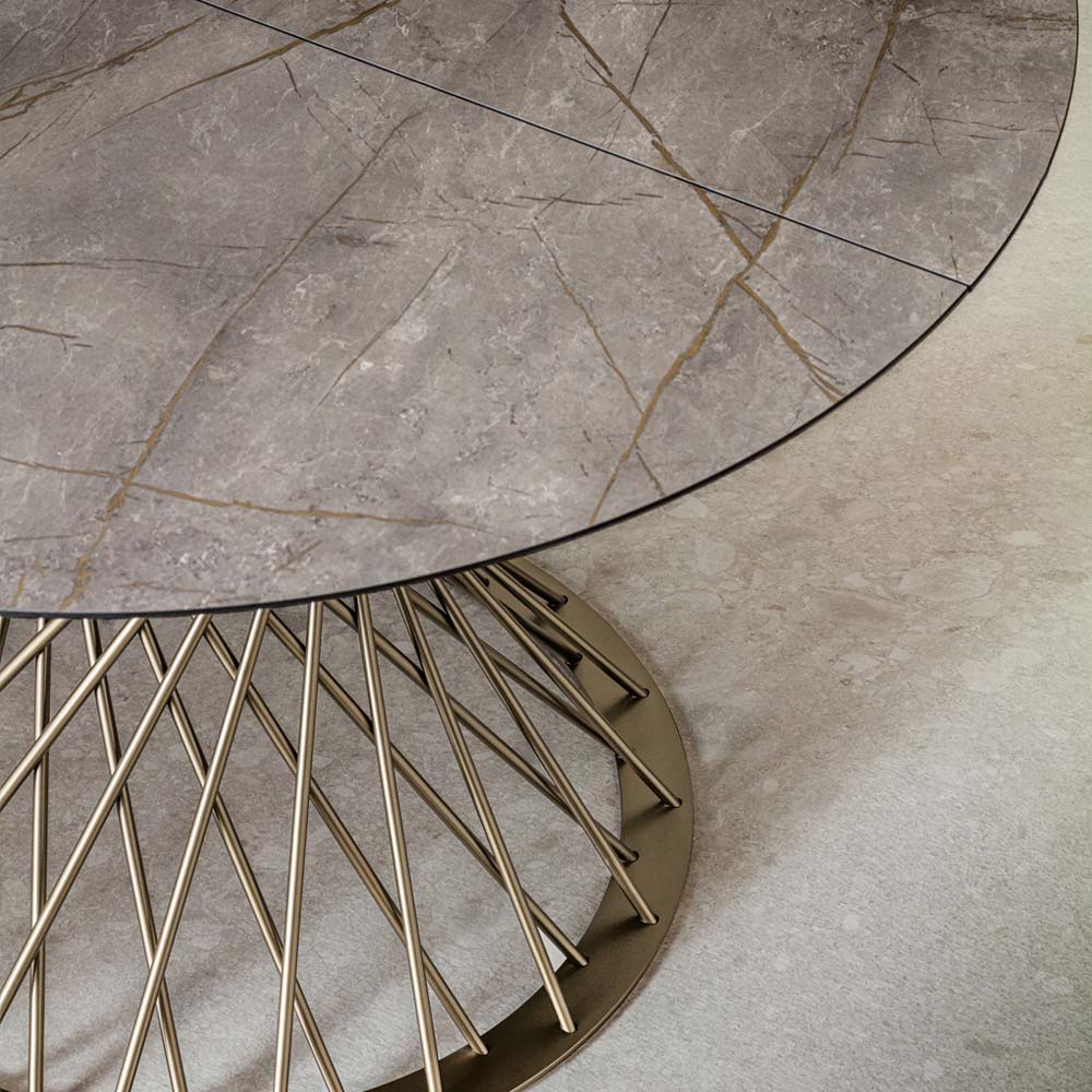 La base est une véritable œuvre d'art : réalisée en métal peint , elle présente un entrelacement de lignes géométriques créant un effet dynamique et surprenant. Une structure solide mais visuellement légère, parfaite pour les environnements modernes, élégants ou représentatifs .