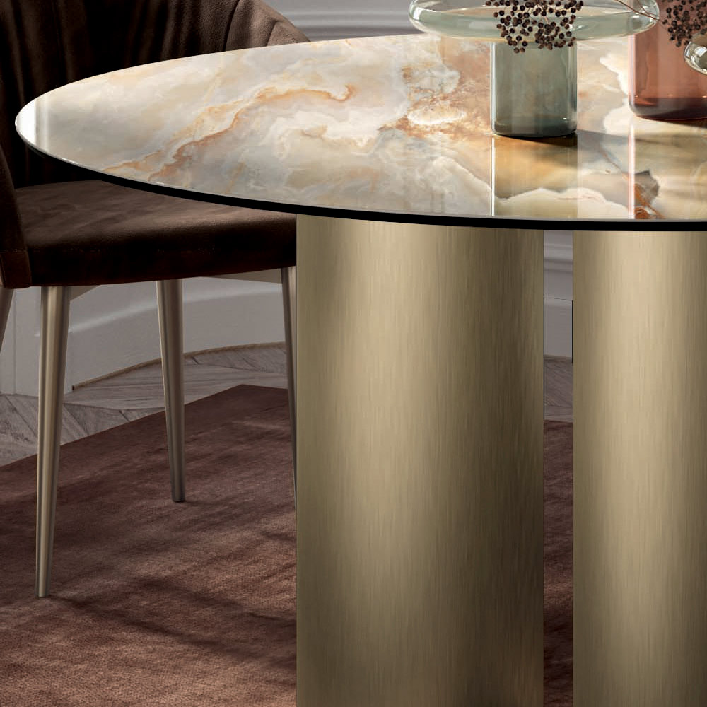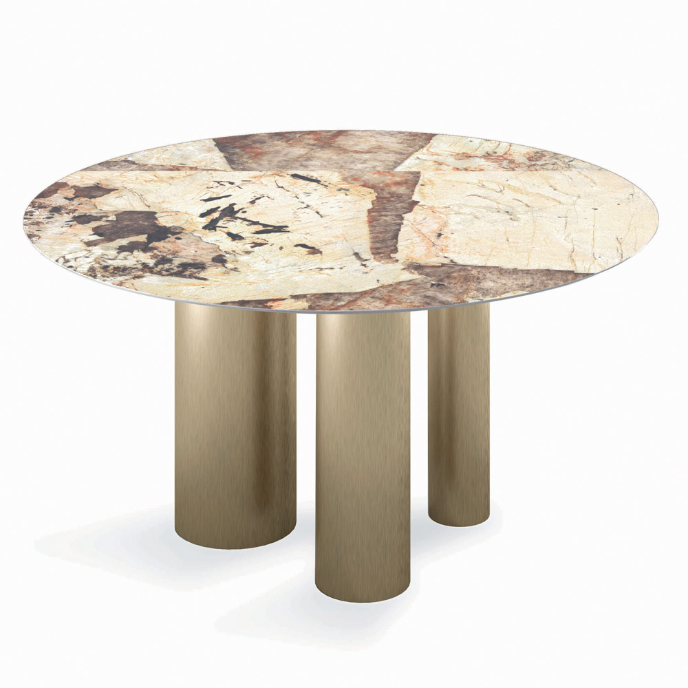 Table de salon ronde fixe avec plateau en céramique , bord biseauté à 45° , piètement en acier laqué champagne et pieds réglables. L'élément caractéristique de ce produit est la base composée de 3 cylindres de tailles différentes qui lui confèrent une élégance et un raffinement uniques . Cette table peut compléter et personnaliser n'importe quel environnement quotidien et contractuel, répondant au mieux aux besoins de conception les plus divers. Il est entièrement fabriqué en Italie en choisissant des matériaux de première qualité et en prêtant attention à chaque détail.