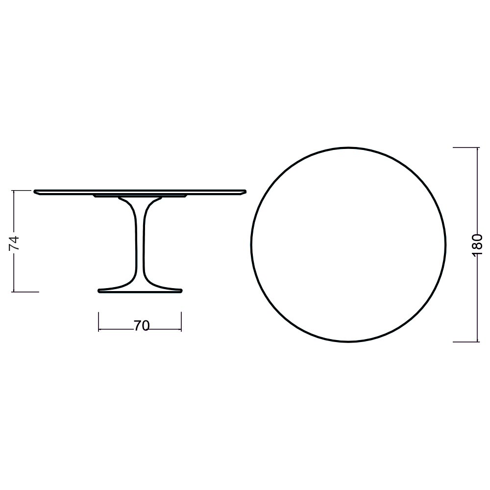 Table diamètre 180 x hauteur 74 cm / Diamètre du piètement 70 cm