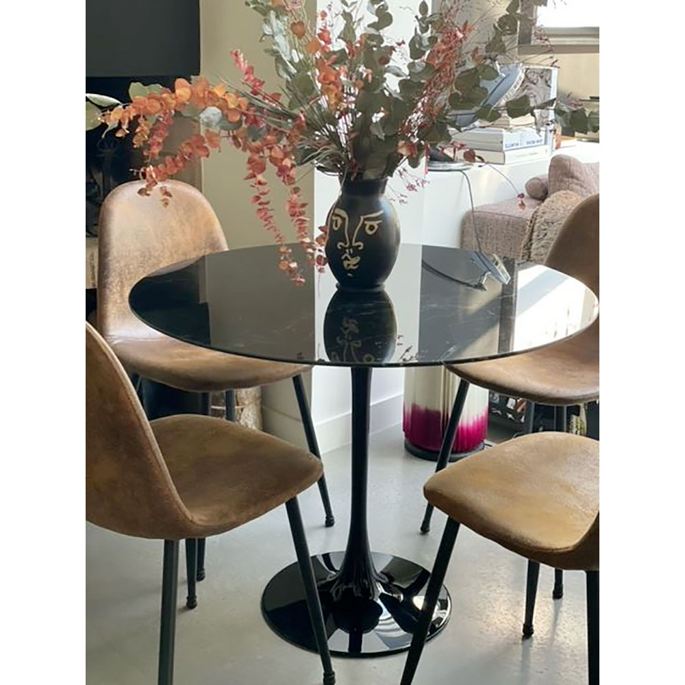 Table à manger avec plateau rond en marbre marquinia noir et base en aluminium poli fabriqué en Italie