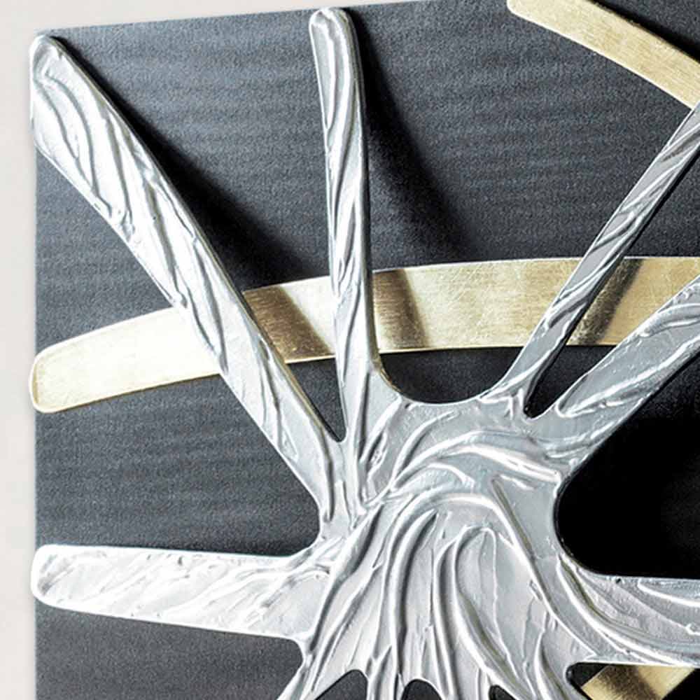 Structures courbes superposées avec détails de céramique. Spider est décoré à la main avec feuilles d'or et d'argent sur une toile laquée noire.