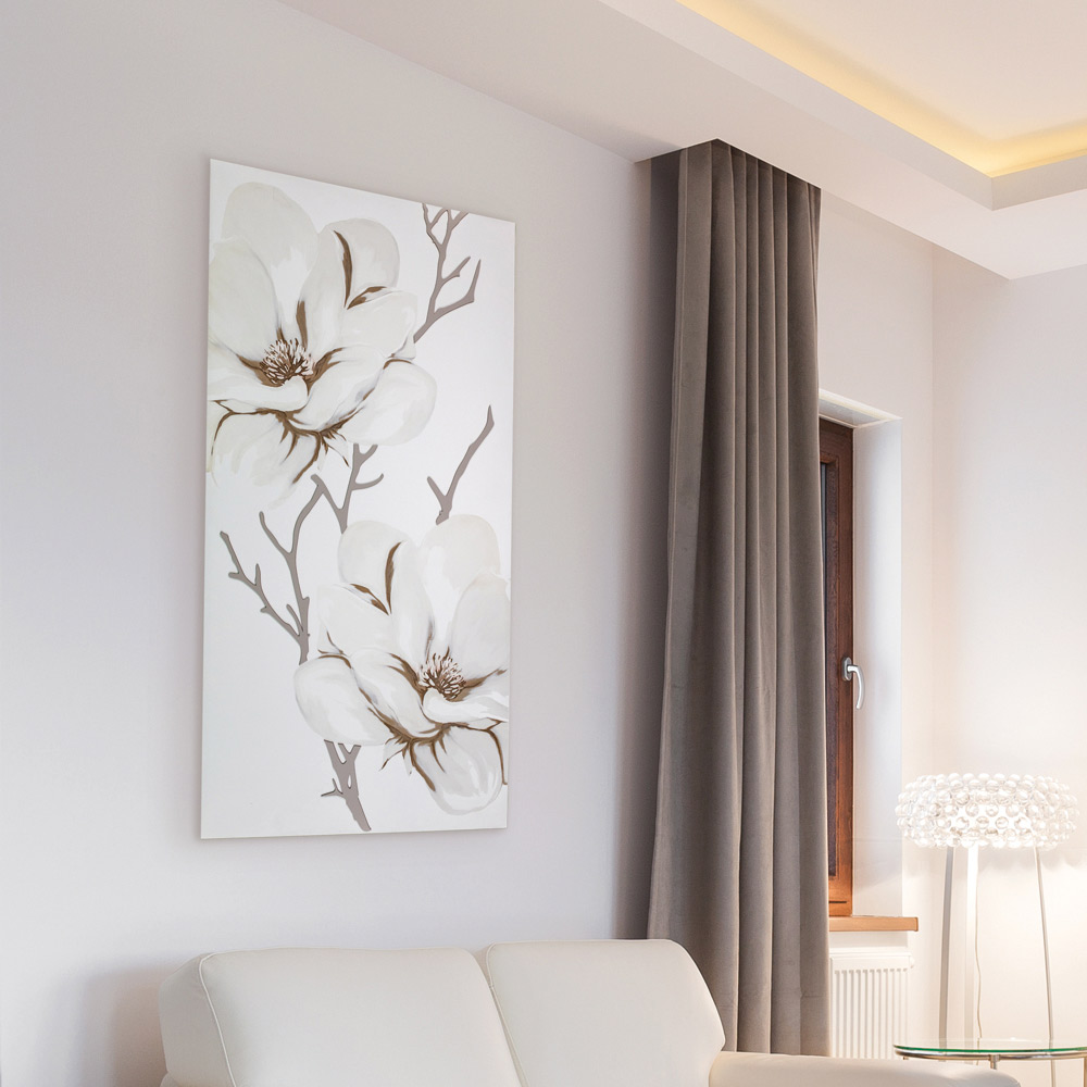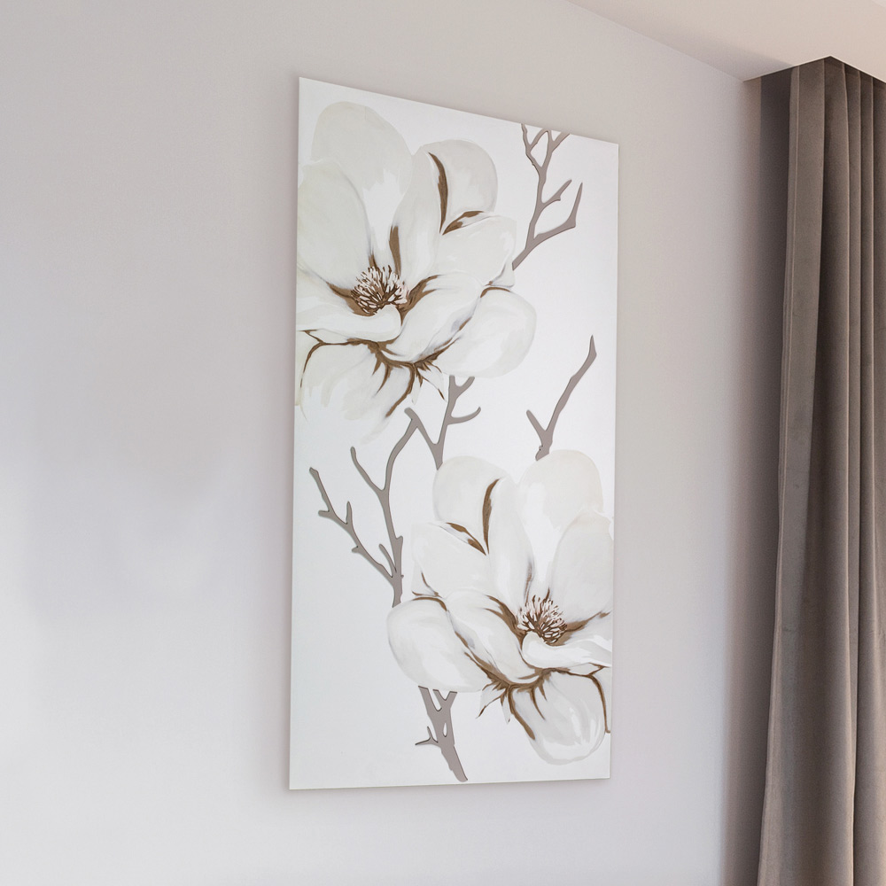 Le panneau avec décoration est réalisé à l'aide de la technique de marquage au laser qui crée un bas-relief sur le matériau, créant différents dégradés de couleurs des pétales créés sur le panneau. Le panneau Magnolia est en bois laqué blanc mat avec des applications de couleur galet . Un meuble élégant avec deux délicates fleurs de Magnolia, gravées en détail au laser avec des décorations de couleur galet.