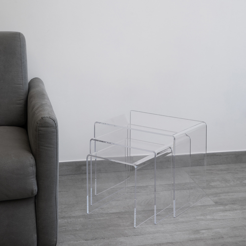 Tables basses triptyque en cristal acrylique transparent, fabriquées en Italie.