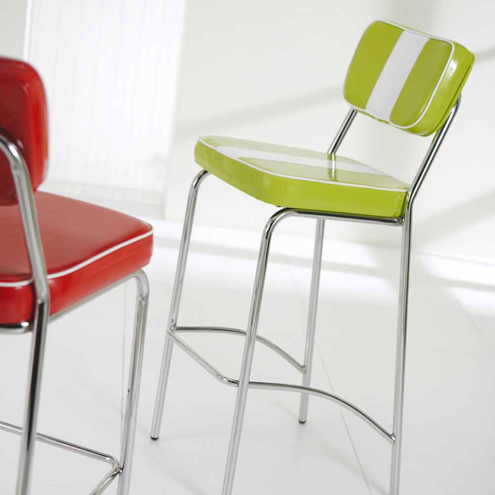 Tabouret design Banda, avec structure chromée et cuir écologique grafiti avec bord blanc et bande blanche centrale.