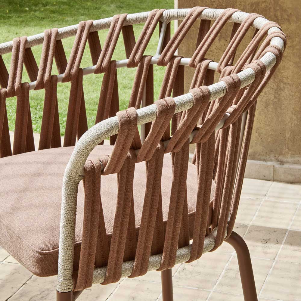 Tabouret de jardin avecstructure en aluminium peinte à la poudre époxy finition rouille, assise en tissu amovible couleur rouille et dossier enaluminium enrichi d'un entrelacement de cordons en tissu acrylique finition rouille, entièrement fabriqué en Italie . Une solution d'ameublement innovante et fraîche , idéale pour satisfaire le regard grâce à son esthétique élégante et moderne tout en offrant une assise accueillante et particulièrement confortable .